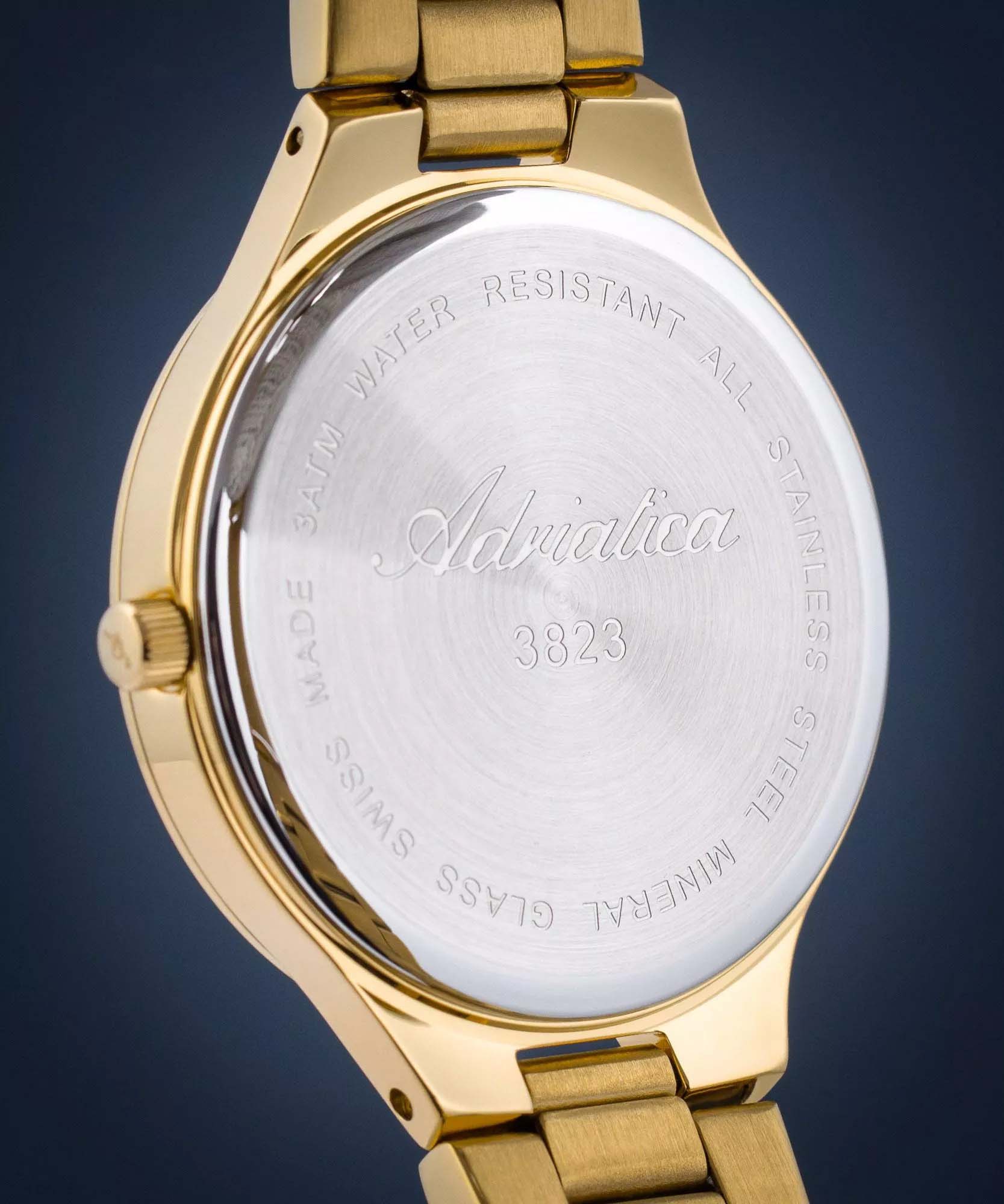 Женские кварцевые часы Adriatica A3823.1161Q — это элегантный аксессуар швейцарского производства с корпусом круглой формы. Корпус и браслет выполнены из стали с PVD-покрытиемPVDУльтратонкое покрытие наносится в технике вакуумного напыления, сочетает в себе нитрид титана особой прочности со слоем золота или оксида хрома. Несёт в себе декоративную или защитную функцию. и защищены минеральным стекломМинеральное стеклоМинеральное стекло представляет собой искусственно выращенный минерал кварца. Такое стекло отличается особой устойчивостью к повреждениям и царапинам. Уступает по некоторым качествам сапфировому стеклу.. Циферблат шампань с эффектом Sunray (солнечные лучи) оформлен штрихами и римской цифрой 12, что придаёт модели изысканный вид. Браслет фиксируется на раскладной застёжкеРаскладная застёжкаТакой тип застёжки используется только на браслетах из металла. Она никогда не раскрывается полностью, происходит разделение на 2 и более частей. Раскладывающая застёжка снизит вероятность потери часов к минимуму.. Часы оснащены точным кварцевым механизмом калибра Ronda 783. Водонепроницаемость 30 м позволит защитить корпус от случайных брызг или капель дождя.