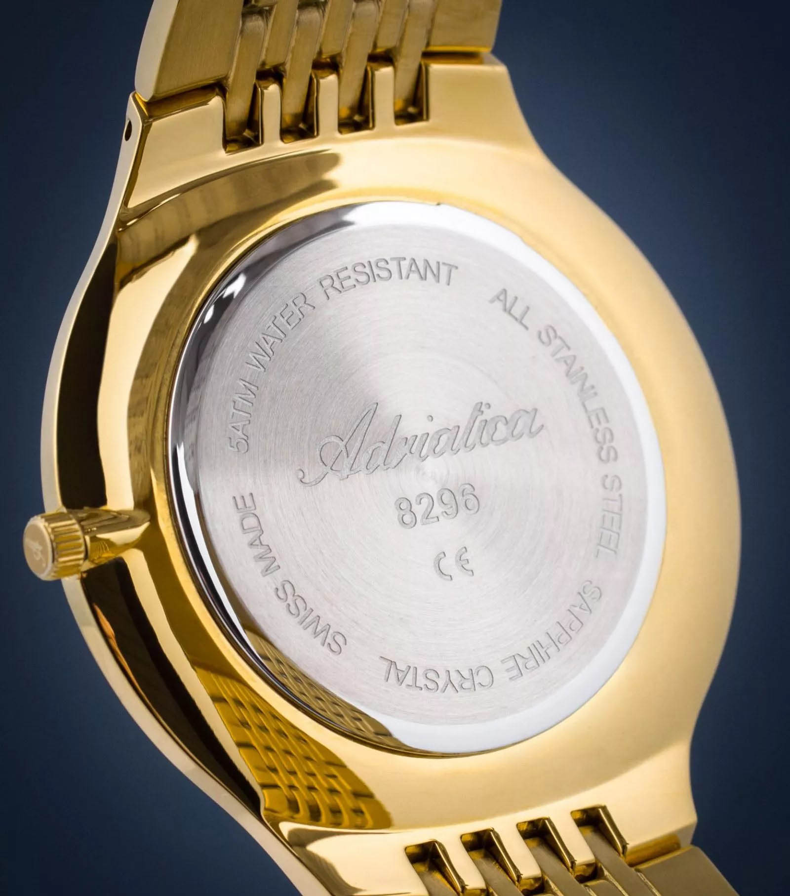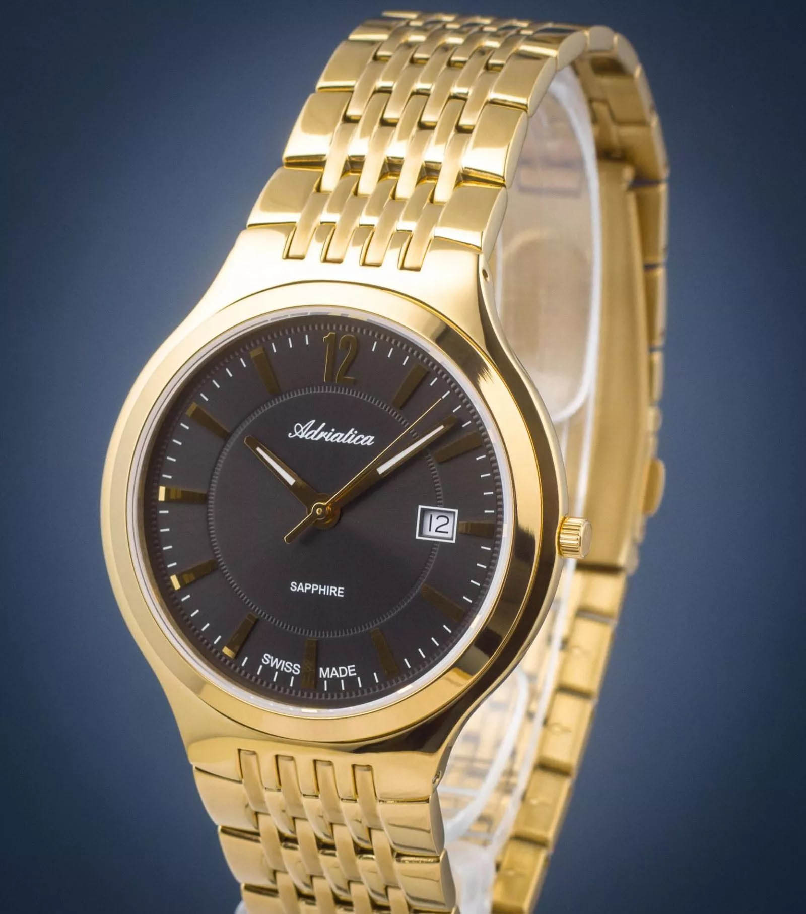 Мужские швейцарские наручные часы Adriatica Premiere A8296.1156Q, кварцевый механизм с высокой точностью. Сапфировое стеклоСапфировое стеклоПрочный и надёжный материал из кристалла сапфира синтетического происхождения, характеризующийся особой твёрдостью и устойчивостью к царапинам и повреждениям. устойчивое к появлению царапин, обладающее высокой прозрачностью. Класс водозащиты: 50 метров, позволит защитить корпус от случайных брызг или капель дождя. Корпус часов изготовлен из стали с PVD-покрытиемPVDУльтратонкое покрытие наносится в технике вакуумного напыления, сочетает в себе нитрид титана особой прочности со слоем золота или оксида хрома. Несёт в себе декоративную или защитную функцию.. Стальной браслет на раскладной застёжкеРаскладная застёжкаТакой тип застёжки используется только на браслетах из металла. Она никогда не раскрывается полностью, происходит разделение на 2 и более частей. Раскладывающая застёжка снизит вероятность потери часов к минимуму. с PVD-покрытиемPVDУльтратонкое покрытие наносится в технике вакуумного напыления, сочетает в себе нитрид титана особой прочности со слоем золота или оксида хрома. Несёт в себе декоративную или защитную функцию..