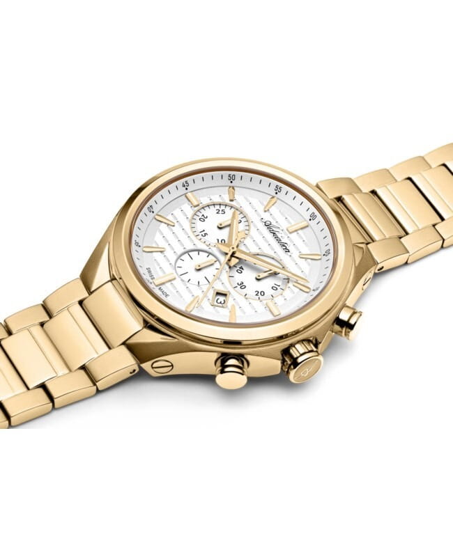 Мужские швейцарские часы-хронографХронографФункция позволяет измерять отрезки времени с особой точностью: часы, минуты, секунды. Верным признаком хронографа является наличие на циферблате 3 дополнительных окошек-счётчиков. Adriatica Passion A8334.1113CH воплощают в себе элегантность и функциональность, их выбирают целеустремленные мужчины, которые знают цену времени. Белый циферблат часов, защищенный сапфировым стекломСапфировое стеклоПрочный и надёжный материал из кристалла сапфира синтетического происхождения, характеризующийся особой твёрдостью и устойчивостью к царапинам и повреждениям., заключен в корпус и безельБезельВнешний ободок, закрепляющий стекло. В спортивных часах так называется поворотное кольцо с делениями на циферблате, выполняет роль таймера – замеряет отрезки времени на шкале. Неподвижный безель – элемент декора. Однонаправленно вращающийся безель на дайверских часах позволяет фиксировать моменты погружения и выныривания на поверхность. из нержавеющей стали с золотистым PVDPVDУльтратонкое покрытие наносится в технике вакуумного напыления, сочетает в себе нитрид титана особой прочности со слоем золота или оксида хрома. Несёт в себе декоративную или защитную функцию. покрытием диаметром 46 мм и толщиной 11 мм. Надежный кварцевый механизм с калибром Ronda 5030 обеспечивает высокую точность, а водозащита 5 ATM делает часы устойчивыми к воздействию воды. Стальной браслет с золотистым PVDPVDУльтратонкое покрытие наносится в технике вакуумного напыления, сочетает в себе нитрид титана особой прочности со слоем золота или оксида хрома. Несёт в себе декоративную или защитную функцию. покрытием и раскладной застёжкойРаскладная застёжкаТакой тип застёжки используется только на браслетах из металла. Она никогда не раскрывается полностью, происходит разделение на 2 и более частей. Раскладывающая застёжка снизит вероятность потери часов к минимуму. обеспечивает комфортное и надежное ношение. Циферблат с метками в виде штрихов имеет 3 дополнительных циферблата, а также окошко даты в положении «4:30» , что добавляет практичности в повседневной жизни.