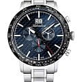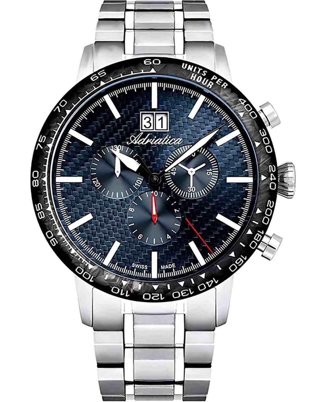 Мужские швейцарские часы-хронографХронографФункция позволяет измерять отрезки времени с особой точностью: часы, минуты, секунды. Верным признаком хронографа является наличие на циферблате 3 дополнительных окошек-счётчиков. с секундомеромСекундомерСекундоме́р — прибор, способный измерять интервалы времени с точностью до долей секунды. и  тахиметромТахиметрРазмеченная шкала, располагается на ободке или безеле часов. Тахиметр позволяет рассчитать скорость на определённом участке пути, расстояние измеряется в километрах или милях. Adriatica  Aviation A8383.4115CH воплощают в себе элегантность и функциональность, их выбирают целеустремленные мужчины, которые знают цену времени. Карбоновый синий циферблат часов, защищенный сапфировым стекломСапфировое стеклоПрочный и надёжный материал из кристалла сапфира синтетического происхождения, характеризующийся особой твёрдостью и устойчивостью к царапинам и повреждениям., заключен в корпус из титана диаметром 46 мм и толщиной 12 мм. Надежный кварцевый механизм с калибром Ronda 5040.B обеспечивает высокую точность, а водозащита 5 ATM делает часы устойчивыми к воздействию воды. Стальной браслет с раскладной застёжкойРаскладная застёжкаТакой тип застёжки используется только на браслетах из металла. Она никогда не раскрывается полностью, происходит разделение на 2 и более частей. Раскладывающая застёжка снизит вероятность потери часов к минимуму. обеспечивает комфортное и надежное ношение. Циферблат с метками в виде штрихов имеет 3 дополнительных циферблата, а также окошко даты в положении «12» , что добавляет практичности в повседневной жизни. Люминесцентное покрытиеЛюминесцентное покрытиеПозволяет считывать показания времени в темноте. Производители наносят на стрелки, часовые индексы, безель или поверхность циферблата светонакопительный состав, дающий холодное свечение. на стрелках и метках обеспечивает отличную видимость в темноте.