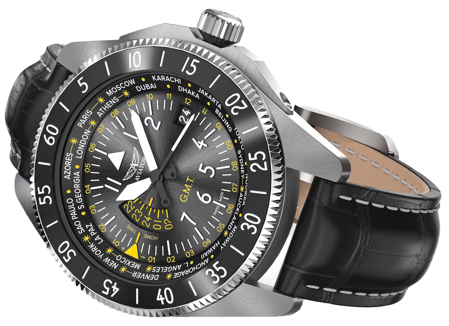 Airacobra GMT — инструментальное сочетание часовой точности, удобной функциональности GMT и авиационной эстетики, предназначенное для тех, кто ценит практичность и стиль в равной мере.