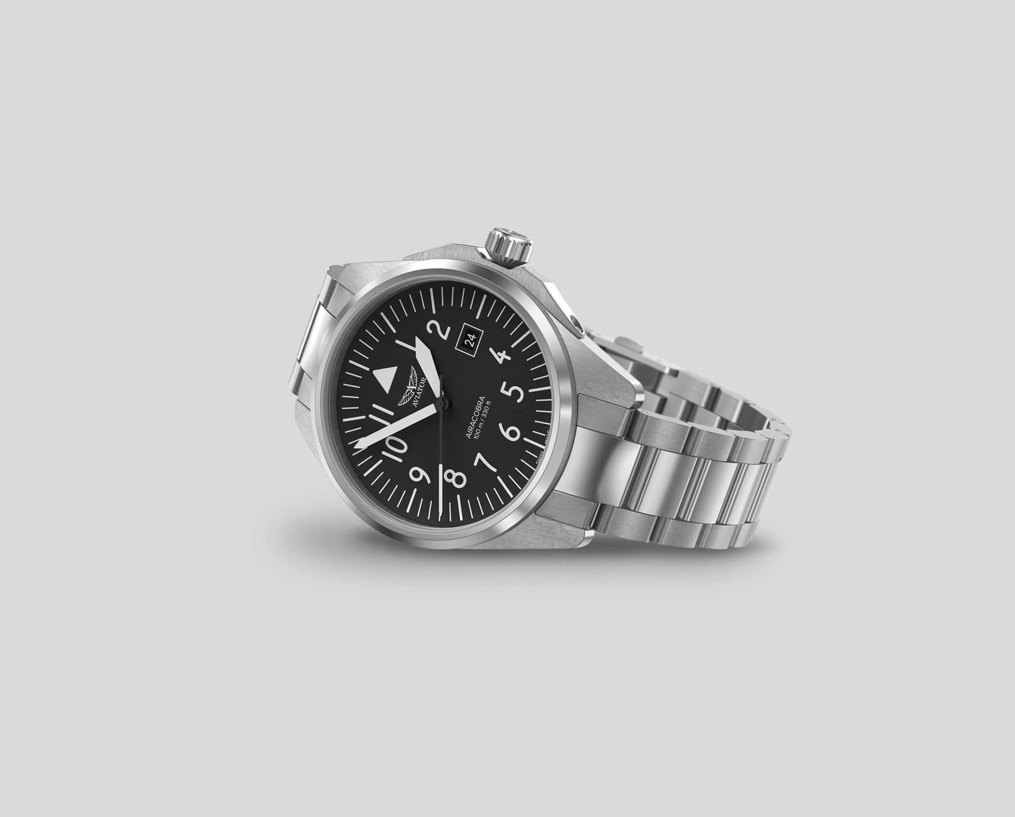 Aviator V.1.38.0.315.5 “Airacobra 43 Type B” — надёжные швейцарские пилотские часы с насыщенным функционалом и строгим авиационным дизайном. Корпус диаметром 42,8 мм выполнен из нержавеющей стали.