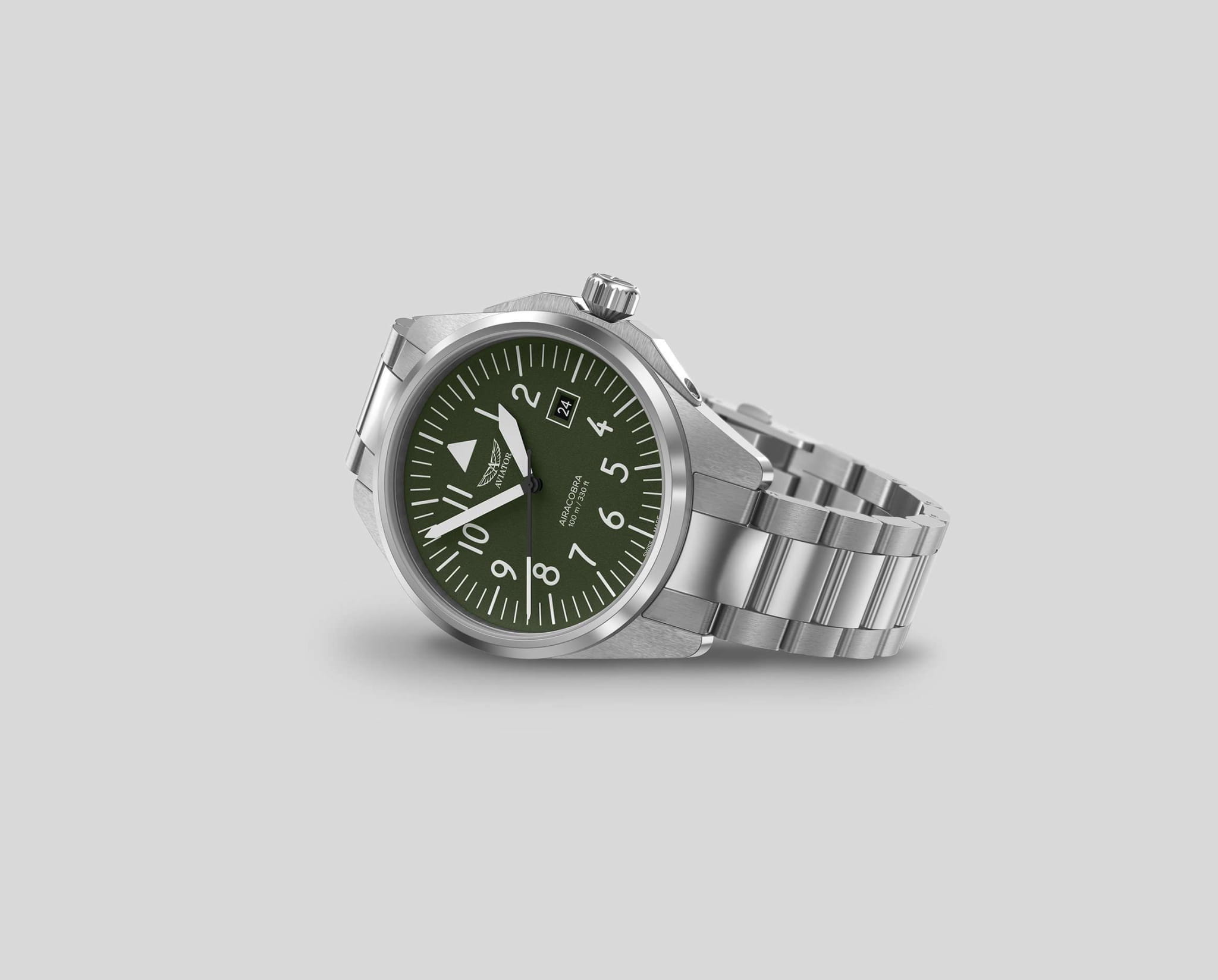 Aviator V.1.38.0.319.5 “Airacobra 43 Type A” — надёжные швейцарские пилотские часы с насыщенным функционалом и строгим авиационным дизайном. Корпус диаметром 42,8 мм выполнен из нержавеющей стали.