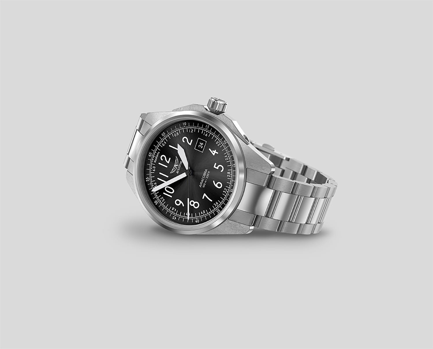 Aviator Airacobra 43 Type B V.1.38.0.322.5 — надёжные швейцарские пилотские часы с насыщенным функционалом и строгим авиационным дизайном. Корпус диаметром 42,8 мм выполнен из нержавеющей стали 316L. Элегантный циферблат имеет крупные арабские цифры. Стрелки и метки покрыты люминесцентным покрытиемЛюминесцентное покрытиеПозволяет считывать показания времени в темноте. Производители наносят на стрелки, часовые индексы, безель или поверхность циферблата светонакопительный состав, дающий холодное свечение. Superluminova — это обеспечивает отличную читаемость в любых условиях. Окошко даты расположено у отметки «3 часа». На борту установлен швейцарский кварцевый механизм, способный с высокой точностью отображать время, дату. В механизме 4 камня. Изысканный циферблат защищён стойким сапфировым стекломСапфировое стеклоПрочный и надёжный материал из кристалла сапфира синтетического происхождения, характеризующийся особой твёрдостью и устойчивостью к царапинам и повреждениям. с антибликовым покрытиемАнтибликовое покрытиеСлой оксида металла в 0,13-0,3 микрон, благодаря которому стекло часов не бликует и не отражает свет. Антибликовое покрытие уменьшает отражение света в 10 раз, обеспечивая отличную читаемость показателей циферблата., завинчивающаяся заводная головка и задняя крышка обеспечивают уровень водозащиты до 100 метров. Стальной браслет с раскладной застёжкойРаскладная застёжкаТакой тип застёжки используется только на браслетах из металла. Она никогда не раскрывается полностью, происходит разделение на 2 и более частей. Раскладывающая застёжка снизит вероятность потери часов к минимуму. обеспечивает удобство и надёжную фиксацию. Airacobra 43 Type B — инструментальные пилотские часы для тех, кто ценит надёжность, точность и удобную функциональность второго часового пояса в эстетике классических авиационных хронометров. Лимитированная серия.