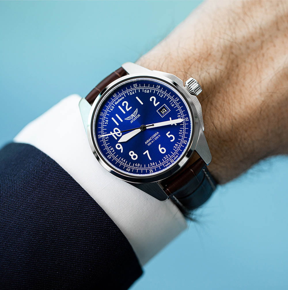 Aviator Airacobra 43 Type B V.1.38.0.325.4 — надёжные швейцарские пилотские часы с насыщенным функционалом и строгим авиационным дизайном. Корпус диаметром 42,8 мм выполнен из нержавеющей стали 316L. Циферблат имеет крупные арабские цифры и жёсткий контраст, соответствующий классическим пилотским образцам. Стрелки и метки покрыты люминесцентным покрытиемЛюминесцентное покрытиеПозволяет считывать показания времени в темноте. Производители наносят на стрелки, часовые индексы, безель или поверхность циферблата светонакопительный состав, дающий холодное свечение. Superluminova — это обеспечивает отличную читаемость в любых условиях. Окошко даты расположено у отметки «3 часа». На борту установлен швейцарский кварцевый механизм, способный с высокой точностью отображать время, дату. Циферблат защищён стойким сапфировым стекломСапфировое стеклоПрочный и надёжный материал из кристалла сапфира синтетического происхождения, характеризующийся особой твёрдостью и устойчивостью к царапинам и повреждениям. с антибликовым покрытиемАнтибликовое покрытиеСлой оксида металла в 0,13-0,3 микрон, благодаря которому стекло часов не бликует и не отражает свет. Антибликовое покрытие уменьшает отражение света в 10 раз, обеспечивая отличную читаемость показателей циферблата., завинчивающаяся заводная головка и задняя крышка обеспечивают уровень водозащиты до 100 метров. Кожаный ремень со стандартной застежкой обеспечивает удобство и надёжную фиксацию. Airacobra 43 Type B — инструментальные пилотские часы для тех, кто ценит надёжность, точность и удобную функциональность второго часового пояса в эстетике классических авиационных хронометров.