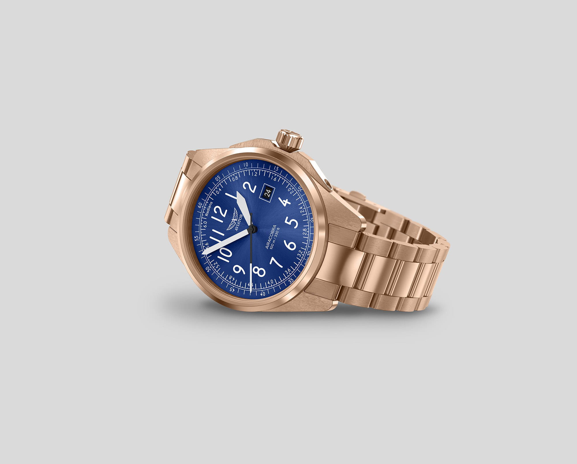 Aviator Airacobra 43 Type B V.1.38.2.325.5 — надёжные швейцарские пилотские часы с насыщенным функционалом и строгим авиационным дизайном. Корпус диаметром 42,8 мм выполнен из нержавеющей стали  316L с PVD-покрытиемPVDУльтратонкое покрытие наносится в технике вакуумного напыления, сочетает в себе нитрид титана особой прочности со слоем золота или оксида хрома. Несёт в себе декоративную или защитную функцию.. Циферблат имеет крупные арабские цифры и жёсткий контраст, соответствующий классическим пилотским образцам. Стрелки и метки покрыты люминесцентным покрытиемЛюминесцентное покрытиеПозволяет считывать показания времени в темноте. Производители наносят на стрелки, часовые индексы, безель или поверхность циферблата светонакопительный состав, дающий холодное свечение. Superluminova — это обеспечивает отличную читаемость в любых условиях. Окошко даты расположено у отметки «3 часа». На борту установлен швейцарский кварцевый механизм, способный с высокой точностью отображать время, дату. В механизме 4 камня. Изысканный циферблат защищён стойким сапфировым стекломСапфировое стеклоПрочный и надёжный материал из кристалла сапфира синтетического происхождения, характеризующийся особой твёрдостью и устойчивостью к царапинам и повреждениям. с антибликовым покрытиемАнтибликовое покрытиеСлой оксида металла в 0,13-0,3 микрон, благодаря которому стекло часов не бликует и не отражает свет. Антибликовое покрытие уменьшает отражение света в 10 раз, обеспечивая отличную читаемость показателей циферблата., завинчивающаяся заводная головка и задняя крышка обеспечивают уровень водозащиты до 100 метров. Стальной браслет с PVD-покрытиемPVDУльтратонкое покрытие наносится в технике вакуумного напыления, сочетает в себе нитрид титана особой прочности со слоем золота или оксида хрома. Несёт в себе декоративную или защитную функцию. с раскладной застёжкойРаскладная застёжкаТакой тип застёжки используется только на браслетах из металла. Она никогда не раскрывается полностью, происходит разделение на 2 и более частей. Раскладывающая застёжка снизит вероятность потери часов к минимуму. обеспечивает удобство и надёжную фиксацию. Airacobra 43 Type B — инструментальные пилотские часы для тех, кто ценит надёжность, точность и удобную функциональность второго часового пояса в эстетике классических авиационных хронометров. Лимитированная серия.
