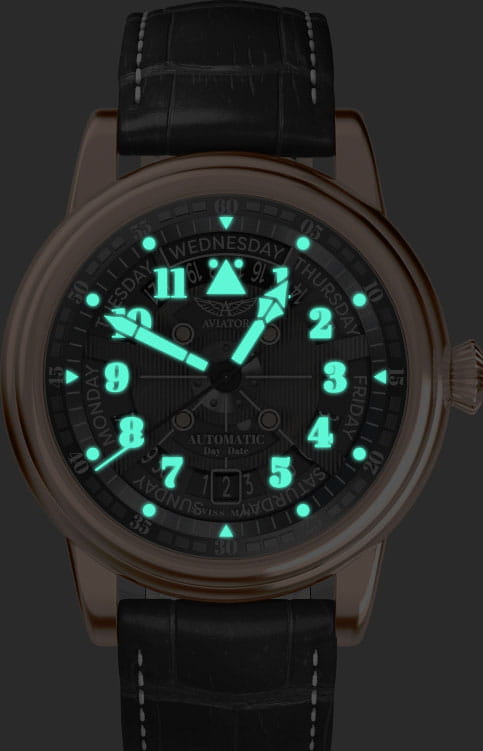 Aviator Douglas Day Date V.3.36.2.289.4 — швейцарские часы в классике авиадизайна, сочетающие безупречную читаемость и высокую надёжность. Лимитированная серия. Корпус диаметром 41 мм выполнен из нержавеющей стали 316L с PVD-покрытиемPVDУльтратонкое покрытие наносится в технике вакуумного напыления, сочетает в себе нитрид титана особой прочности со слоем золота или оксида хрома. Несёт в себе декоративную или защитную функцию. цвета розового золота. Накладные метки выполнены в виде арабских цифр. Окошко даты находится в положении 6 часов. День недели находится в положении 12 часов. Часовые метки и стрелки покрыты люминесцентным покрытиемЛюминесцентное покрытиеПозволяет считывать показания времени в темноте. Производители наносят на стрелки, часовые индексы, безель или поверхность циферблата светонакопительный состав, дающий холодное свечение. Superluminova, позволяющим легко определять время даже в тёмное время суток. Поверхность защищена прочным сапфировым стекломСапфировое стеклоПрочный и надёжный материал из кристалла сапфира синтетического происхождения, характеризующийся особой твёрдостью и устойчивостью к царапинам и повреждениям. с антибликовым покрытием, устойчивым к царапинам. Сердце модели — швейцарский механизм Sellita SW 240-2, известный своей точностью и долговечностью. Водозащита 100 метров, позволит плавать, нырять и заниматься другими водными видами спорта. Завинчивающаяся головка и задняя крышка обеспечивают уверенную ударопрочностьУдаропрочный корпусМеханизм заключён в корпус, выполненный из современных материалов, устойчивых к ударам, механическим повреждениям и падению с высоты: инновационный пластик, карбон, нержавеющая сталь, титан. и надёжную защиту от влаги и пыли. В механизме 26 камней, запас хода до 41 час. Модель дополнена кожаным ремешком с выразительной текстурой и классическим стилем, закреплённым с помощью застёжке-бабочке с кнопкамиЗастёжка "бабочка"Такой вид застёжки дополняется предохранителями, помогающими избежать случайного раскрытия браслета. Обладают изящным исполнением. — для максимального комфорта и лёгкости в повседневном использовании. Ротор механизма с заклепанными элементами и вырезанными окнами напоминает фюзеляж самолета. Aviator — это образец лётной точности, инженерной чёткости и сдержанной роскоши, идеально подходящий для тех, кто ценит функциональность и уверенность в каждом элементе.