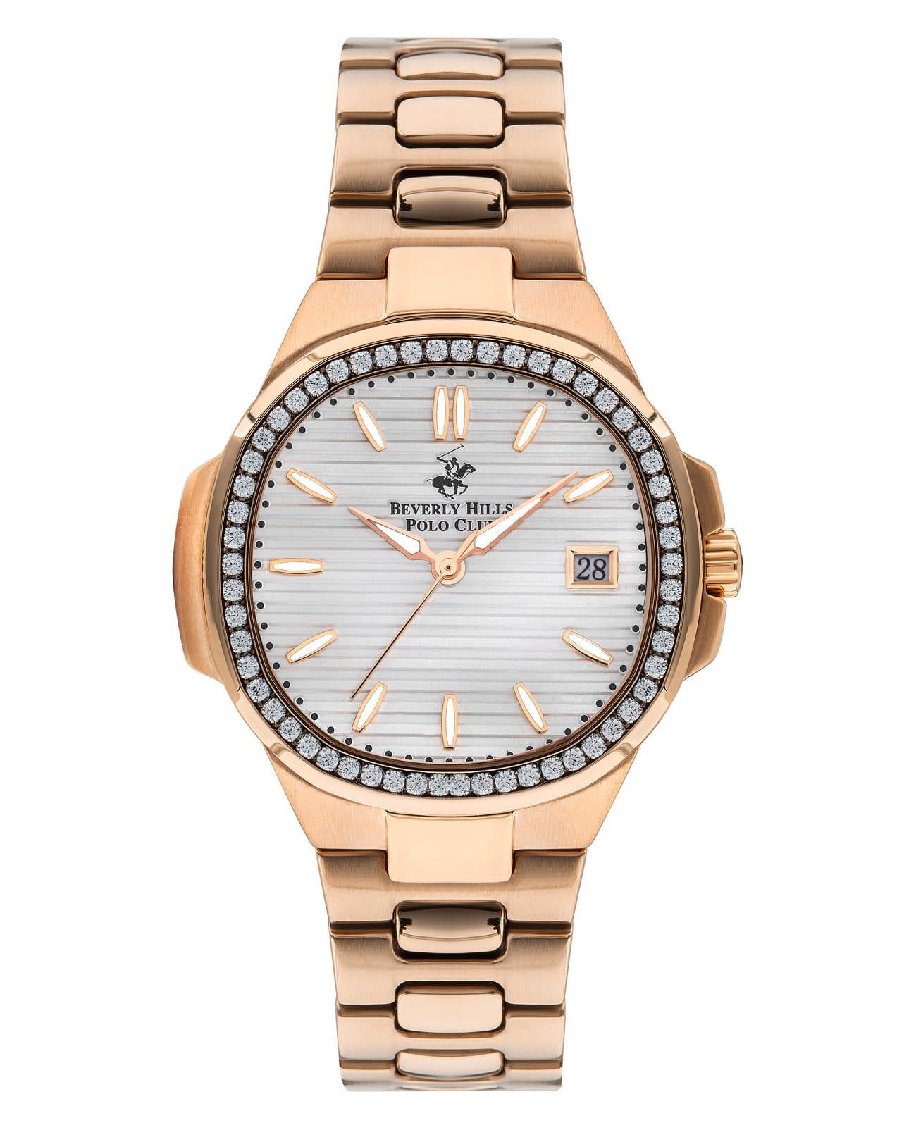 Американские женские часы Beverly Hills Polo Club BP3320X.430 с минеральным стекломМинеральное стеклоМинеральное стекло представляет собой искусственно выращенный минерал кварца. Такое стекло отличается особой устойчивостью к повреждениям и царапинам. Уступает по некоторым качествам сапфировому стеклу. кварцевый механизм с высокой точностью. Класс водозащиты: 30 метров, позволит защитить корпус от случайных брызг или капель дождя. Корпус и браслет часов изготовлены из стали с IP-покрытиемIP-покрытиеМетод ионного напыления. Демонстрирует повышенную устойчивость к истиранию, окислению и химическим веществам. Под воздействием высокого давления и температуры около 1500°C молекулы металла надёжно соединяются с частицами корпуса часов. цветам розовое золото. Стальной браслет на застёжке-бабочке с кнопкамиЗастёжка "бабочка"Такой вид застёжки дополняется предохранителями, помогающими избежать случайного раскрытия браслета. Обладают изящным исполнением. . БезельБезельВнешний ободок, закрепляющий стекло. В спортивных часах так называется поворотное кольцо с делениями на циферблате, выполняет роль таймера – замеряет отрезки времени на шкале. Неподвижный безель – элемент декора. Однонаправленно вращающийся безель на дайверских часах позволяет фиксировать моменты погружения и выныривания на поверхность. инкрустирован кристаллами. Окошко даты находятся в положении 3 часа. Стрелки и метки с люминесцентным покрытиемЛюминесцентное покрытиеПозволяет считывать показания времени в темноте. Производители наносят на стрелки, часовые индексы, безель или поверхность циферблата светонакопительный состав, дающий холодное свечение..