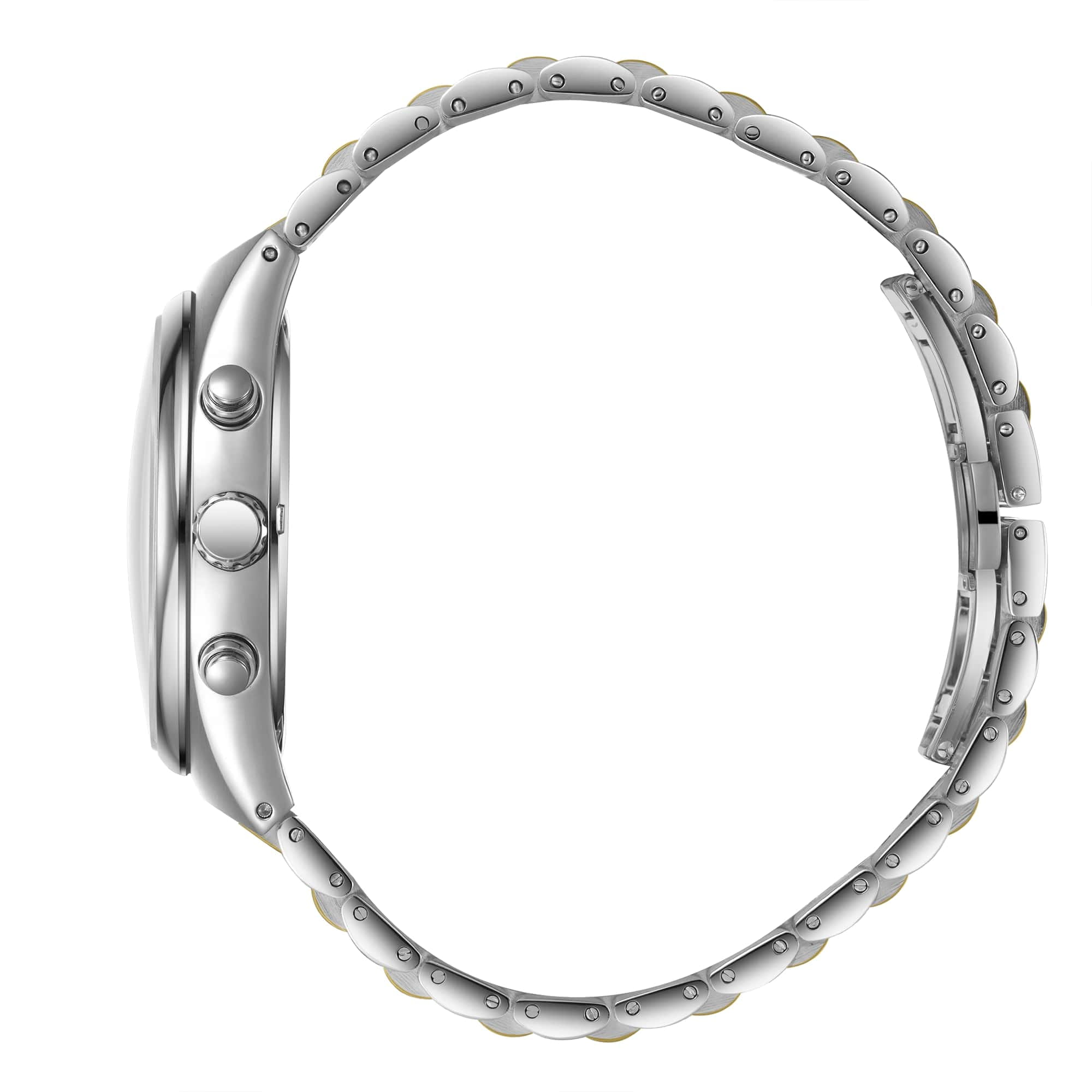 С уровнем водозащиты до 100 метров, эти часы готовы сопровождать вас в любых водных приключениях: будь то плавание, ныряние или активные занятия спортом. Стальной браслет с частичным PVD-покрытиемPVDУльтратонкое покрытие наносится в технике вакуумного напыления, сочетает в себе нитрид титана особой прочности со слоем золота или оксида хрома. Несёт в себе декоративную или защитную функцию. на застёжке-бабочке с кнопкамиЗастёжка "бабочка"Такой вид застёжки дополняется предохранителями, помогающими избежать случайного раскрытия браслета. Обладают изящным исполнением. .