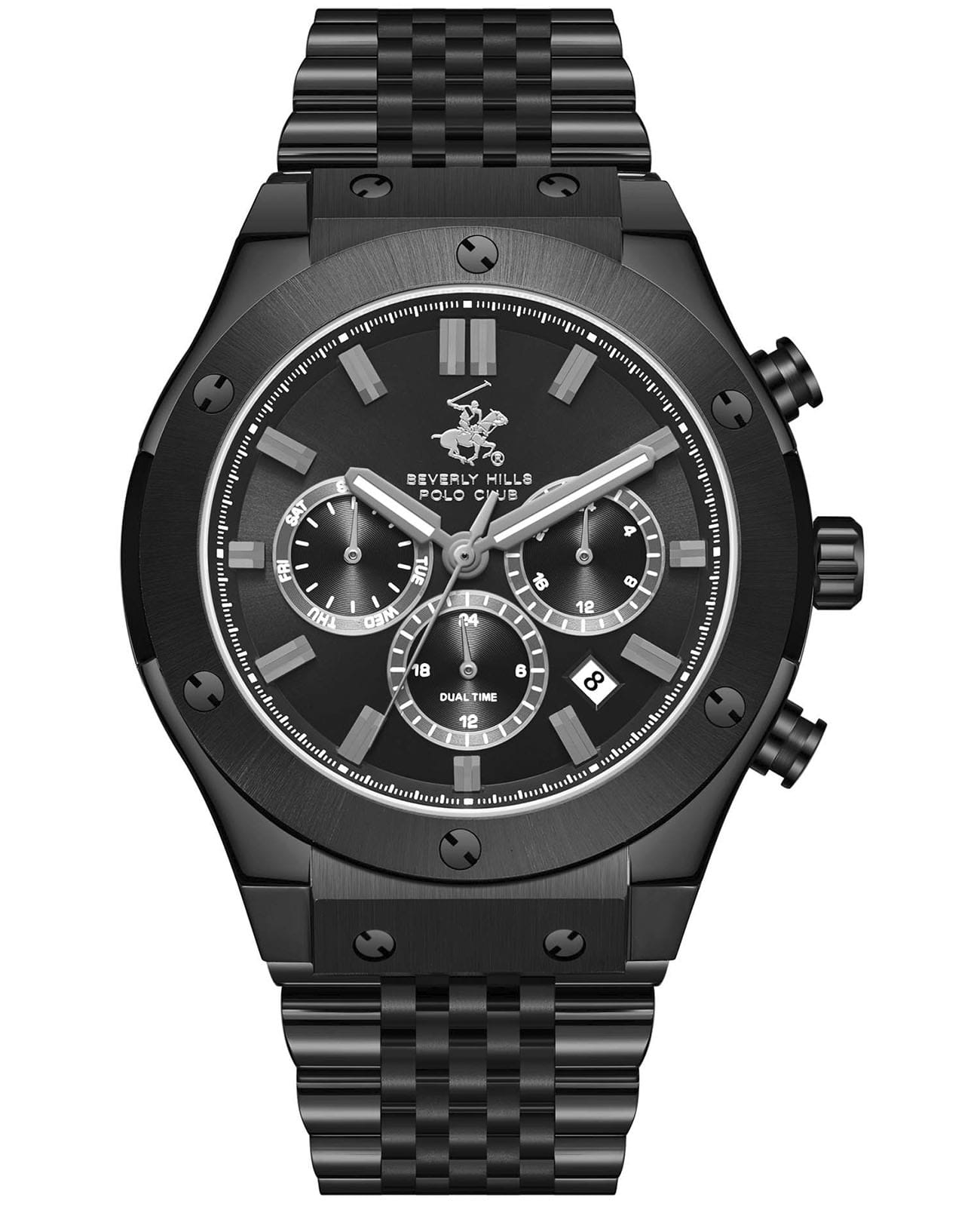 Часы Beverly Hills Polo Club BP3773X.650 — это идеальное сочетание силы, стиля и современных технологий. Модель выполнена в круглом корпусе из высококачественной нержавеющей стали с IP-покрытиемIP-покрытиеМетод ионного напыления. Демонстрирует повышенную устойчивость к истиранию, окислению и химическим веществам. Под воздействием высокого давления и температуры около 1500°C молекулы металла надёжно соединяются с частицами корпуса часов., что гарантирует прочность и долговечность. Механизм часов кварцевый, питание от батарейки, что обеспечивает точность хода и минимальное обслуживание. На циферблате отображаются функции даты, дня недели и 12/24-часовой формат времени, делая их особенно удобными для повседневного использования. Циферблат защищен минеральным стекломМинеральное стеклоМинеральное стекло представляет собой искусственно выращенный минерал кварца. Такое стекло отличается особой устойчивостью к повреждениям и царапинам. Уступает по некоторым качествам сапфировому стеклу. с сапфировым покрытием, которое устойчиво к появлению царапин и сохраняет чистоту взгляда на протяжении длительного времени. Стрелки оснащены люминесцентным покрытиемЛюминесцентное покрытиеПозволяет считывать показания времени в темноте. Производители наносят на стрелки, часовые индексы, безель или поверхность циферблата светонакопительный состав, дающий холодное свечение., обеспечивающим отличную видимость даже при слабом освещении. БезельБезельВнешний ободок, закрепляющий стекло. В спортивных часах так называется поворотное кольцо с делениями на циферблате, выполняет роль таймера – замеряет отрезки времени на шкале. Неподвижный безель – элемент декора. Однонаправленно вращающийся безель на дайверских часах позволяет фиксировать моменты погружения и выныривания на поверхность. с IP-покрытиемIP-покрытиеМетод ионного напыления. Демонстрирует повышенную устойчивость к истиранию, окислению и химическим веществам. Под воздействием высокого давления и температуры около 1500°C молекулы металла надёжно соединяются с частицами корпуса часов.. Стальной браслет с IP-покрытиемIP-покрытиеМетод ионного напыления. Демонстрирует повышенную устойчивость к истиранию, окислению и химическим веществам. Под воздействием высокого давления и температуры около 1500°C молекулы металла надёжно соединяются с частицами корпуса часов. на раскладной застёжкеРаскладная застёжкаТакой тип застёжки используется только на браслетах из металла. Она никогда не раскрывается полностью, происходит разделение на 2 и более частей. Раскладывающая застёжка снизит вероятность потери часов к минимуму.. Часы обладают водозащитой до 50 метров, позволит защитить корпус от случайных брызг или капель дождя.