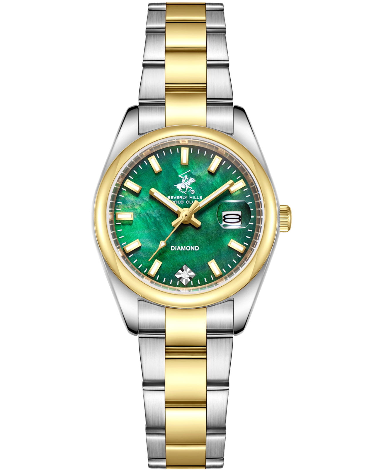 Американские женские часы Beverly Hills Polo Club BP3794X.270 - это стильный женский аксессуар, который сочетает элегантный дизайн и практичность. Корпус выполнен из нержавеющей стали серебристого цвета, диаметром 34,5 мм, что обеспечивает долговечность и утончённый внешний вид. Надежное минеральное стеклоМинеральное стеклоМинеральное стекло представляет собой искусственно выращенный минерал кварца. Такое стекло отличается особой устойчивостью к повреждениям и царапинам. Уступает по некоторым качествам сапфировому стеклу. с сапфировым покрытием защищает циферблат от царапин и обеспечивает долговечность. Метки в виде штрихов, в позиции "6 часов" инкрустирован синтетический бриллиант. Неподвижный безельБезельВнешний ободок, закрепляющий стекло. В спортивных часах так называется поворотное кольцо с делениями на циферблате, выполняет роль таймера – замеряет отрезки времени на шкале. Неподвижный безель – элемент декора. Однонаправленно вращающийся безель на дайверских часах позволяет фиксировать моменты погружения и выныривания на поверхность. с IP-покрытиемIP-покрытиеМетод ионного напыления. Демонстрирует повышенную устойчивость к истиранию, окислению и химическим веществам. Под воздействием высокого давления и температуры около 1500°C молекулы металла надёжно соединяются с частицами корпуса часов. золотистого цвета. Модель оснащена кварцевым механизмом, обеспечивающим высокую точность хода. Стальной браслет с частичным IP-покрытиемIP-покрытиеМетод ионного напыления. Демонстрирует повышенную устойчивость к истиранию, окислению и химическим веществам. Под воздействием высокого давления и температуры около 1500°C молекулы металла надёжно соединяются с частицами корпуса часов. на застёжке-бабочке с кнопкамиЗастёжка "бабочка"Такой вид застёжки дополняется предохранителями, помогающими избежать случайного раскрытия браслета. Обладают изящным исполнением. обеспечивает комфортное ношение. Стрелки и метки оснащены люминесцентным покрытиемЛюминесцентное покрытиеПозволяет считывать показания времени в темноте. Производители наносят на стрелки, часовые индексы, безель или поверхность циферблата светонакопительный состав, дающий холодное свечение., обеспечивающим отличную видимость даже при слабом освещении. Окошко даты находится в положении 3 часа. Водозащита 30 метров позволит защитить корпус от случайных брызг или капель дождя. Эта модель – отличный выбор для тех, кто ищет сочетание стиля, качества и функциональности. Часы станут не только полезным аксессуаром, но и выразительным элементом вашего имиджа.