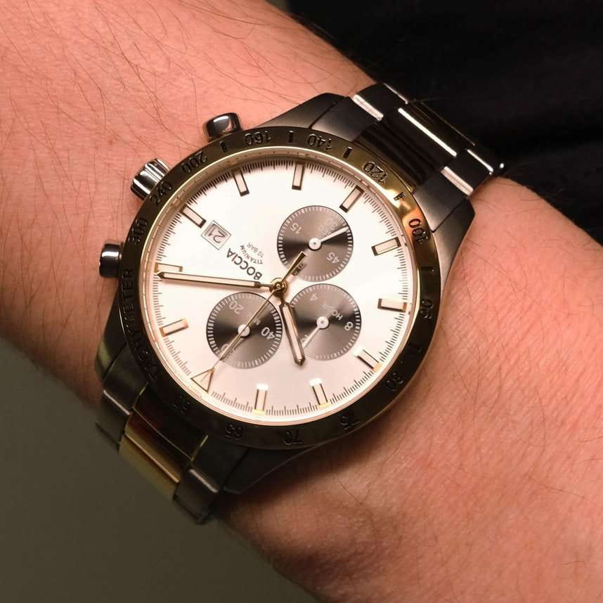 Часы Boccia 3739-04 представляют собой идеальное сочетание стиля и функциональности для современного мужчины. Этот хронографХронографФункция позволяет измерять отрезки времени с особой точностью: часы, минуты, секунды. Верным признаком хронографа является наличие на циферблате 3 дополнительных окошек-счётчиков. оснащен надежным кварцевым механизмом Miyota 0S10, они обеспечивают высокую точность хода. Основное внимание в дизайне уделяется центральным часовой и минутной стрелкам, в то время как изящная секундная стрелка вынесена на малый циферблат, добавляя нотку утонченной асимметрии. На отметке 3 часов расположена аккуратная апертура даты, обеспечивающая удобство и практичность в повседневной жизни. Функция секундомераСекундомерСекундоме́р — прибор, способный измерять интервалы времени с точностью до долей секунды. и тахиметрическаяТахиметрРазмеченная шкала, располагается на ободке или безеле часов. Тахиметр позволяет рассчитать скорость на определённом участке пути, расстояние измеряется в километрах или милях. шкала предоставляют дополнительные возможности для активных и динамичных людей, ценящих не только стиль, но и функциональность. Серебристый циферблат излучает спокойствие и гармонию, заключенный в круглый корпус из суперлегкого титана. Это не только придает часам современный вид, но и обеспечивает невероятный комфорт на запястье. Часы дополнены титановым безелемБезельВнешний ободок, закрепляющий стекло. В спортивных часах так называется поворотное кольцо с делениями на циферблате, выполняет роль таймера – замеряет отрезки времени на шкале. Неподвижный безель – элемент декора. Однонаправленно вращающийся безель на дайверских часах позволяет фиксировать моменты погружения и выныривания на поверхность. с PVDPVDУльтратонкое покрытие наносится в технике вакуумного напыления, сочетает в себе нитрид титана особой прочности со слоем золота или оксида хрома. Несёт в себе декоративную или защитную функцию.-покрытием цвета желтого золота. Стрелки и метки часов покрыты люминесцентным покрытиемЛюминесцентное покрытиеПозволяет считывать показания времени в темноте. Производители наносят на стрелки, часовые индексы, безель или поверхность циферблата светонакопительный состав, дающий холодное свечение., которое мягко светится в темноте, освещая путь даже в самых загадочных сумерках. Титановый браслет с PVDPVDУльтратонкое покрытие наносится в технике вакуумного напыления, сочетает в себе нитрид титана особой прочности со слоем золота или оксида хрома. Несёт в себе декоративную или защитную функцию.-покрытием и раскладной застёжкойРаскладная застёжкаТакой тип застёжки используется только на браслетах из металла. Она никогда не раскрывается полностью, происходит разделение на 2 и более частей. Раскладывающая застёжка снизит вероятность потери часов к минимуму. добавляет элегантности и обеспечивает надежную фиксацию на руке. Часы защищены прочным минеральным стекломМинеральное стеклоМинеральное стекло представляет собой искусственно выращенный минерал кварца. Такое стекло отличается особой устойчивостью к повреждениям и царапинам. Уступает по некоторым качествам сапфировому стеклу., устойчивым к мелким механическим повреждениям, что сохраняет их безупречный вид при повседневном использовании. Водо