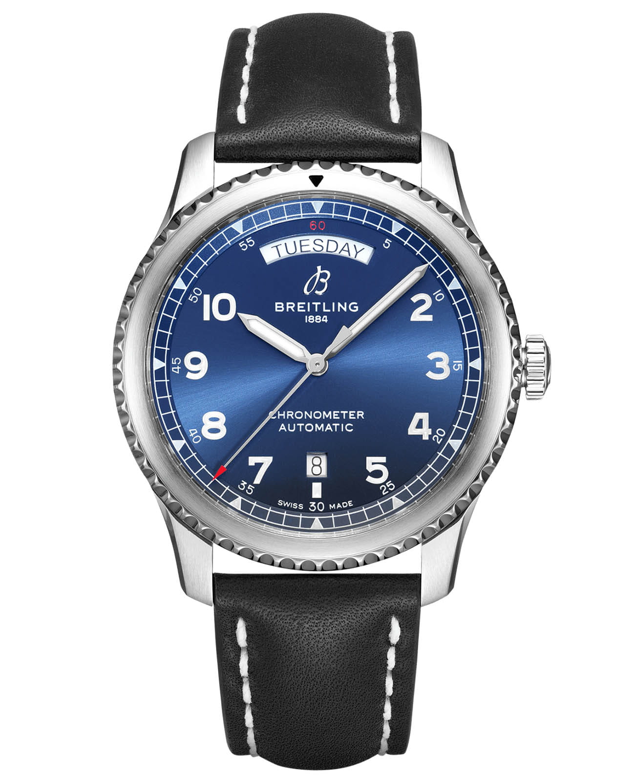Модель Aviator 8 Automatic Day & Date 41 A45330101C1X1 отображает день недели, дату и время. Индикатор дня недели размещен в положении «12 часов» симметрично дате, в положении «6 часов». «Сердцем» модели этих автоматических наручных часов является калибр Breitling Caliber 45, а двунаправленный ротор автоподзавода обеспечивает запас хода свыше 40 часов.