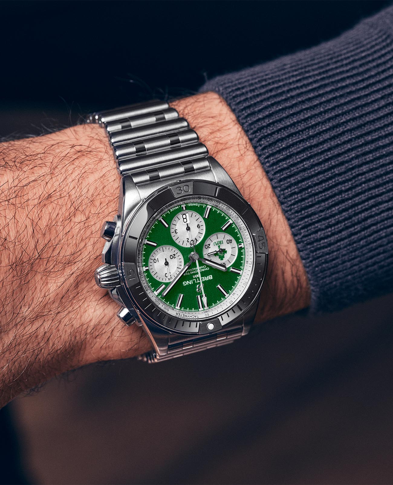 Лимитированные мужские швейцарские часы-хронографХронографФункция позволяет измерять отрезки времени с особой точностью: часы, минуты, секунды. Верным признаком хронографа является наличие на циферблате 3 дополнительных окошек-счётчиков. с секундомеромСекундомерСекундоме́р — прибор, способный измерять интервалы времени с точностью до долей секунды. Breitling Chronomat B01 42 Ireland AB0134A91L1A1, механический механизм (автоматический калибр) с высокой точностью. Основанный на хронографе Frecce Tricolori, который был разработан и выпущен в 1983 году в сотрудничестве со знаменитой итальянской авиационной эскадрильей, Chronomat стильно отпраздновал столетие Breitling и ознаменовал возвращение механическому хронографу его законного места в бренде, который построил свою мировую репутацию на этих невероятных часах. Сапфировое стеклоСапфировое стеклоПрочный и надёжный материал из кристалла сапфира синтетического происхождения, характеризующийся особой твёрдостью и устойчивостью к царапинам и повреждениям. устойчивое к появлению царапин, обладающее высокой прозрачностью. Класс водозащиты: 200 метров, позволит плавать, нырять и заниматься другими водными видами спорта. Корпус и браслет часов изготовлены из нержавеющей стали. Часы имеют сертификат COSCСертификат COSCОфициальный сертификат, подтверждающий то, что часы ходят с особо высокой точностью. Для получения документа часы подвергаются тестовым испытаниям, разработанным швейцарским институтом тестирования хронометров COSC. Допустимая норма для механических часов -4/+6 секунд в день, для кварцевых моделей +/- 0,07 секунд в день.. Стрелки и метки с люминесцентным покрытиемЛюминесцентное покрытиеПозволяет считывать показания времени в темноте. Производители наносят на стрелки, часовые индексы, безель или поверхность циферблата светонакопительный состав, дающий холодное свечение.. Шкала тахиметраТахиметрРазмеченная шкала, располагается на ободке или безеле часов. Тахиметр позволяет рассчитать скорость на определённом участке пути, расстояние измеряется в километрах или милях. на циферблате. Окошко даты находится в положении 6 часов. Браслет с застёжкой-бабочкой с кнопкамиЗастёжка "бабочка"Такой вид застёжки дополняется предохранителями, помогающими избежать случайного раскрытия браслета. Обладают изящным исполнением. .
