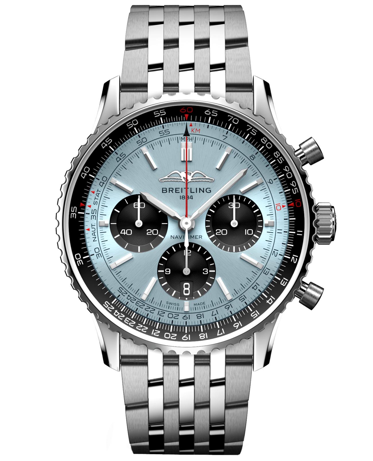 Мужские швейцарские часы-хронографХронографФункция позволяет измерять отрезки времени с особой точностью: часы, минуты, секунды. Верным признаком хронографа является наличие на циферблате 3 дополнительных окошек-счётчиков. с секундомеромСекундомерСекундоме́р — прибор, способный измерять интервалы времени с точностью до долей секунды. Breitling Navitimer B01 Chronograph 43 AB0138241C1A1, механический механизм (автоматический калибр) с высокой точностью. Сапфировое стеклоСапфировое стеклоПрочный и надёжный материал из кристалла сапфира синтетического происхождения, характеризующийся особой твёрдостью и устойчивостью к царапинам и повреждениям. с антибликовым покрытием устойчивое к появлению царапин, обладающее высокой прозрачностью. Класс водозащиты: 30 метров, позволит защитить корпус от случайных брызг или капель дождя. Корпус часов изготовлен из стали. Стальной браслет с застёжкой-бабочкой с кнопкамиЗастёжка "бабочка"Такой вид застёжки дополняется предохранителями, помогающими избежать случайного раскрытия браслета. Обладают изящным исполнением. . Шкала тахиметраТахиметрРазмеченная шкала, располагается на ободке или безеле часов. Тахиметр позволяет рассчитать скорость на определённом участке пути, расстояние измеряется в километрах или милях. на циферблате. Часы имеют сертификат COSCСертификат COSCОфициальный сертификат, подтверждающий то, что часы ходят с особо высокой точностью. Для получения документа часы подвергаются тестовым испытаниям, разработанным швейцарским институтом тестирования хронометров COSC. Допустимая норма для механических часов -4/+6 секунд в день, для кварцевых моделей +/- 0,07 секунд в день.. Окошко даты находится в положении 6 часов. Стрелки и метки с люминесцентным покрытиемЛюминесцентное покрытиеПозволяет считывать показания времени в темноте. Производители наносят на стрелки, часовые индексы, безель или поверхность циферблата светонакопительный состав, дающий холодное свечение..