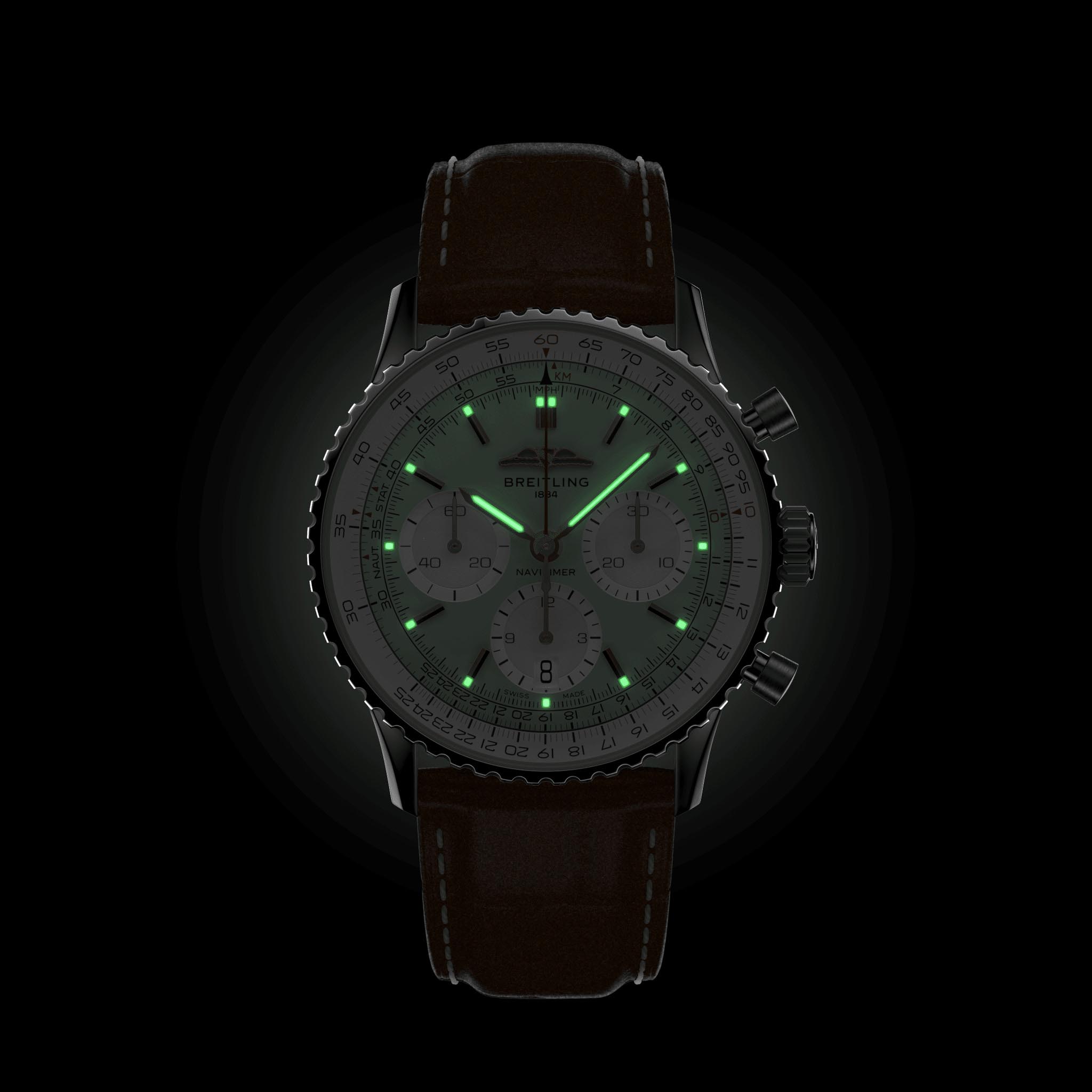 Мужские швейцарские часы-хронографХронографФункция позволяет измерять отрезки времени с особой точностью: часы, минуты, секунды. Верным признаком хронографа является наличие на циферблате 3 дополнительных окошек-счётчиков. с секундомеромСекундомерСекундоме́р — прибор, способный измерять интервалы времени с точностью до долей секунды. Breitling Navitimer B01 Chronograph 41 AB0139211L1P1, механический механизм (автоматический калибр) с высокой точностью. Сапфировое стеклоСапфировое стеклоПрочный и надёжный материал из кристалла сапфира синтетического происхождения, характеризующийся особой твёрдостью и устойчивостью к царапинам и повреждениям. устойчивое к появлению царапин, обладающее высокой прозрачностью. Класс водозащиты: 30 метров, позволит защитить корпус от случайных брызг или капель дождя. Корпус часов изготовлен из стали. Кожаный ремешок с раскладной застёжкойРаскладная застёжкаТакой тип застёжки используется только на браслетах из металла. Она никогда не раскрывается полностью, происходит разделение на 2 и более частей. Раскладывающая застёжка снизит вероятность потери часов к минимуму.. Шкала тахиметраТахиметрРазмеченная шкала, располагается на ободке или безеле часов. Тахиметр позволяет рассчитать скорость на определённом участке пути, расстояние измеряется в километрах или милях. на циферблате. Часы имеют сертификат COSCСертификат COSCОфициальный сертификат, подтверждающий то, что часы ходят с особо высокой точностью. Для получения документа часы подвергаются тестовым испытаниям, разработанным швейцарским институтом тестирования хронометров COSC. Допустимая норма для механических часов -4/+6 секунд в день, для кварцевых моделей +/- 0,07 секунд в день.. Окошко даты находится в положении 6 часов. Стрелки и метки с люминесцентным покрытиемЛюминесцентное покрытиеПозволяет считывать показания времени в темноте. Производители наносят на стрелки, часовые индексы, безель или поверхность циферблата светонакопительный состав, дающий холодное свечение..