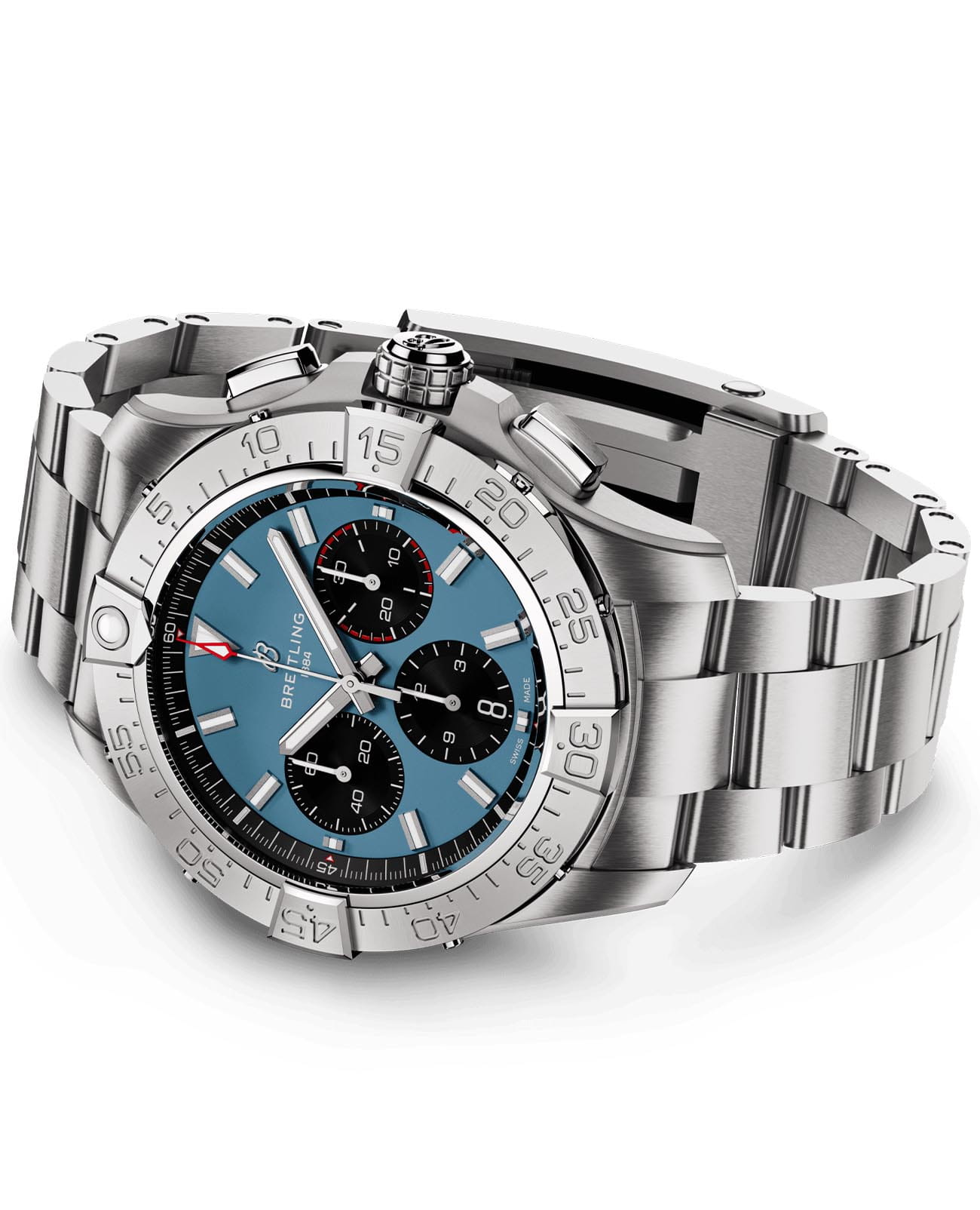 Мужские наручные часы c хронографомХронографФункция позволяет измерять отрезки времени с особой точностью: часы, минуты, секунды. Верным признаком хронографа является наличие на циферблате 3 дополнительных окошек-счётчиков. Breitling Avenger B01 Chronograph 44 AB0147101C1A1 с надёжным автоматическим механизмом. Корпус часов изготовлен из нержавеющей стали. Сапфировое стеклоСапфировое стеклоПрочный и надёжный материал из кристалла сапфира синтетического происхождения, характеризующийся особой твёрдостью и устойчивостью к царапинам и повреждениям. с антибликовым покрытием, устойчивое к мелким механическим повреждениям. Стальной браслет с раскладной застёжкойРаскладная застёжкаТакой тип застёжки используется только на браслетах из металла. Она никогда не раскрывается полностью, происходит разделение на 2 и более частей. Раскладывающая застёжка снизит вероятность потери часов к минимуму.. Стрелки и метки с люминесцентным покрытиемЛюминесцентное покрытиеПозволяет считывать показания времени в темноте. Производители наносят на стрелки, часовые индексы, безель или поверхность циферблата светонакопительный состав, дающий холодное свечение.. Однонаправленный безельБезельВнешний ободок, закрепляющий стекло. В спортивных часах так называется поворотное кольцо с делениями на циферблате, выполняет роль таймера – замеряет отрезки времени на шкале. Неподвижный безель – элемент декора. Однонаправленно вращающийся безель на дайверских часах позволяет фиксировать моменты погружения и выныривания на поверхность.. Класс водозащиты: 300 метров, позволит плавать, нырять и заниматься другими водными видами спорта.
