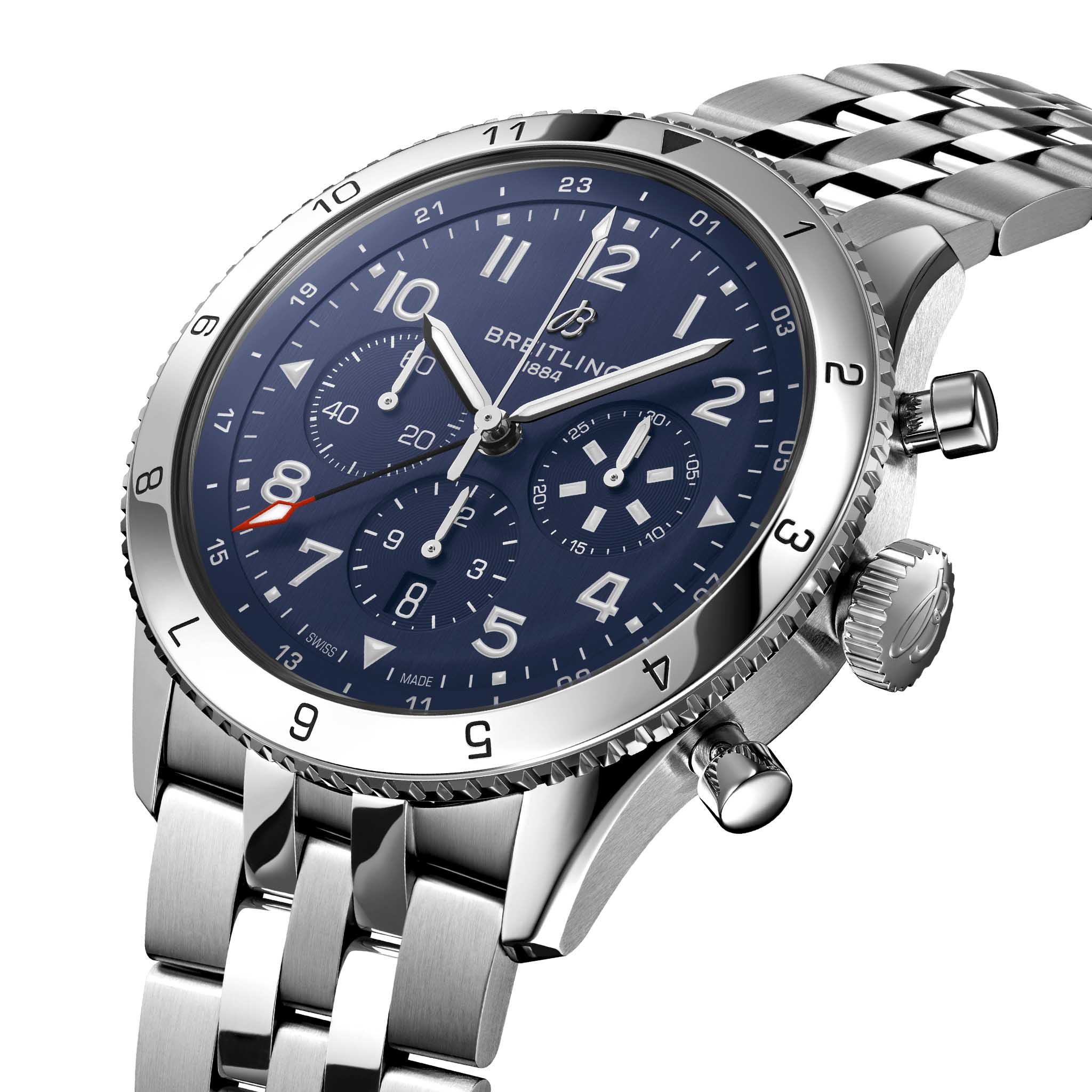 История Breitling неотделима от полета - от смелых первых взлетов до зарождения коммерческих авиаперевозок. В 1930-х годах авиационное подразделение Breitling Huit сделало себе имя, изобретя точные часы в кабине пилота. Два десятилетия спустя компания представила еще один новый летный прибор, на этот раз в носимой форме: Ref. 765 AVI. Эти новаторские часы для пилота послужили технической основой для сегодняшней коллекции Super AVI, вдохновленной суровым духом знаменитых ранних самолетов. Super AVI отдает дань уважения Vought F4U Corsair в честь одной из таких легенд. Как военно-морскому самолету времен Второй мировой войны, "Корсару" приходилось совершать сложные взлеты и посадки с авианосцев и удаленных посадочных полос. Скорость и подъемная сила были решающими, и самолет справился с задачей с честью, став первым одномоторным истребителем, преодолев отметку в 400 миль в час (640 км/ч), а также обеспечив исключительную скороподъемность. Его дизайн “изогнутого крыла”, большой пропеллер и фирменная синяя ливрея делают его эмблемой истории авиации. Часы Super AVI Tribute to Vought F4U Corsair, предназначенные для настоящих пилотов, выдерживающих суровые условия винтажного кокпита, украшены крупными, хорошо читаемыми арабскими цифрами на циферблате и безелеБезельВнешний ободок, закрепляющий стекло. В спортивных часах так называется поворотное кольцо с делениями на циферблате, выполняет роль таймера – замеряет отрезки времени на шкале. Неподвижный безель – элемент декора. Однонаправленно вращающийся безель на дайверских часах позволяет фиксировать моменты погружения и выныривания на поверхность.. Крупногабаритная заводная головка и рифленый безельБезельВнешний ободок, закрепляющий стекло. В спортивных часах так называется поворотное кольцо с делениями на циферблате, выполняет роль таймера – замеряет отрезки времени на шкале. Неподвижный безель – элемент декора. Однонаправленно вращающийся безель на дайверских часах позволяет фиксировать моменты погружения и выныривания на поверхность. на прочном 46-миллиметровом корпусе обеспечивают оптимальное сцепление даже в руках пилота в перчатках. Прошитые сверху ремешки из телячьей кожи повторяют швы классического летного снаряжения, а дополнительный браслет из нержавеющей стали является элегантной альтернативой. Пилоты и другие путешественники по достоинству оценят возможность отслеживать второй часовой пояс с помощью 24-часовой маркировки на внутреннем безеле и стрелки GMTGMTОтображение времени второго часового пояса.Такая функция особенно актуальна для путешественников и бизнесменов,которые общаются с людьми из разных стран,теперь вы всегда будете знать,какой час у вашего партнёра или близкого человека. с красным наконечником. Двигателем Super AVI является сертифицированный Сертификат COSCСертификат COSCОфициальный сертификат, подтверждающий то, что часы ходят с особо высокой точностью. Для получения документа часы подвергаются тестовым испытаниям, разработанным швейцарским институтом тестирования хронометров COSC. Допустимая норма для механических часов -4/+6 секунд в день, для кварцевых моделей +/- 0,07 секунд в день. механизм Breitling Manufacture Caliber B04, который обеспечивает примерно 70-часовой запас хода.