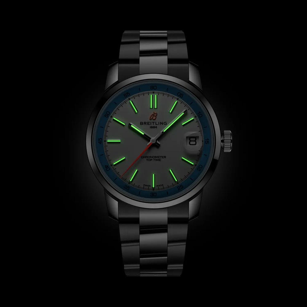 Breitling Top Time B31 AB3113281A1A1 — новаторская модель 2025 года, выполненная в духе ретро-дизайна и оснащённая новым автоматическим механизмом собственного производства. Корпус диаметром 38 мм изготовлен из нержавеющей стали с полированной отделкой. Задняя крышка с винтовым креплением и прозрачным окном демонстрирует работу калибра. Циферблат защищён выпуклым сапфировым стекломСапфировое стеклоПрочный и надёжный материал из кристалла сапфира синтетического происхождения, характеризующийся особой твёрдостью и устойчивостью к царапинам и повреждениям. с двухсторонним антибликовым покрытиемАнтибликовое покрытиеСлой оксида металла в 0,13-0,3 микрон, благодаря которому стекло часов не бликует и не отражает свет. Антибликовое покрытие уменьшает отражение света в 10 раз, обеспечивая отличную читаемость показателей циферблата.. Белый циферблат с бирюзовым внутренним кольцом оформлен в стиле классических приборных панелей. Часовые метки и стрелки покрыты люминесцентным покрытиемЛюминесцентное покрытиеПозволяет считывать показания времени в темноте. Производители наносят на стрелки, часовые индексы, безель или поверхность циферблата светонакопительный состав, дающий холодное свечение., обеспечивая читаемость при любом освещении. Внутри установлен новый автоматический калибр Breitling B31, отображающий часы, минуты и малую секундную стрелку. Запас хода составляет до 78 часов, а частота — 28 800 полуколебаний в час. Модель укомплектована стальным браслетом на раскладной застёжкойРаскладная застёжкаТакой тип застёжки используется только на браслетах из металла. Она никогда не раскрывается полностью, происходит разделение на 2 и более частей. Раскладывающая застёжка снизит вероятность потери часов к минимуму.. Водонепроницаемость 100 метров делает часы практичным выбором для повседневной активности. Top Time B31 AB3113281A1A1 — утончённый стиль, высокоточная механика и характерная винтажная подача в современной интерпретации.