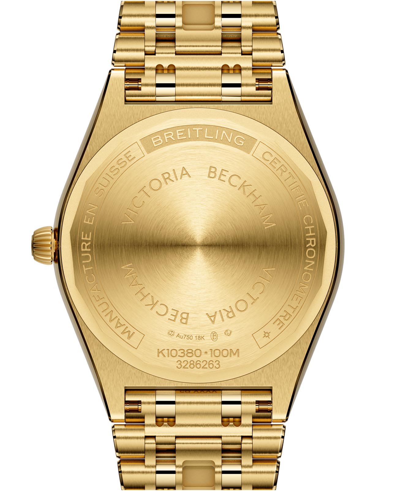 Женские швейцарские часы Breitling Chronomat Automatic 36 Victoria Beckham K103801A1L1K1 с надёжным автоматическим механизмом, выпущенные лимитированной серией всего из 1500 экземпляров в сотрудничестве с модным домом Victoria Beckham. Сапфировое стеклоСапфировое стеклоПрочный и надёжный материал из кристалла сапфира синтетического происхождения, характеризующийся особой твёрдостью и устойчивостью к царапинам и повреждениям. устойчивое к мелким механическим повреждениям. Корпус и браслет часов изготовлены из желтого 18-каратного золота18-каратное золотоОбозначение по каратной системе пробирования, оно показывает, сколько драгоценного металла содержится в изделии. 18 карат - в составе 75% чистого золота, соответствует 750 пробе.