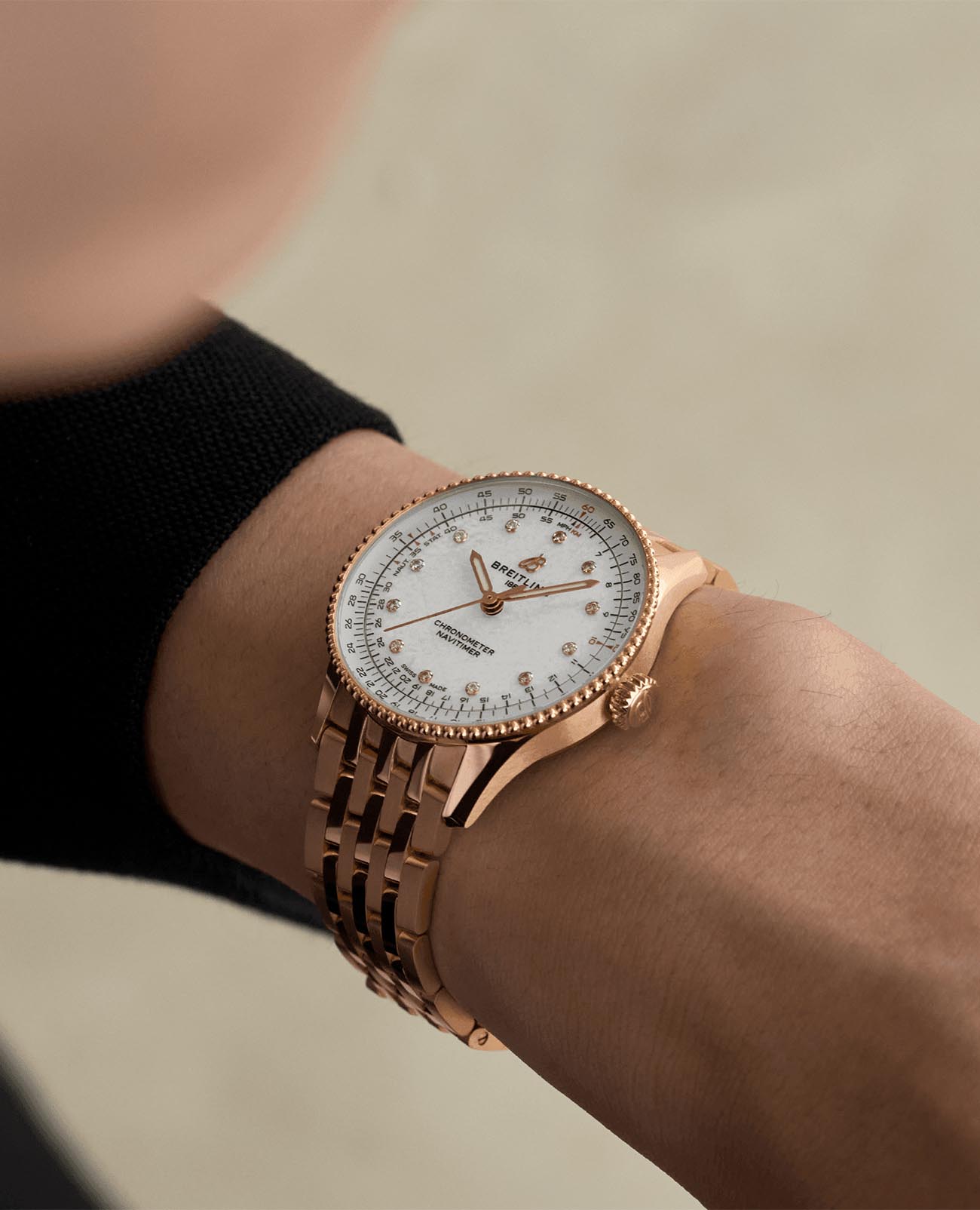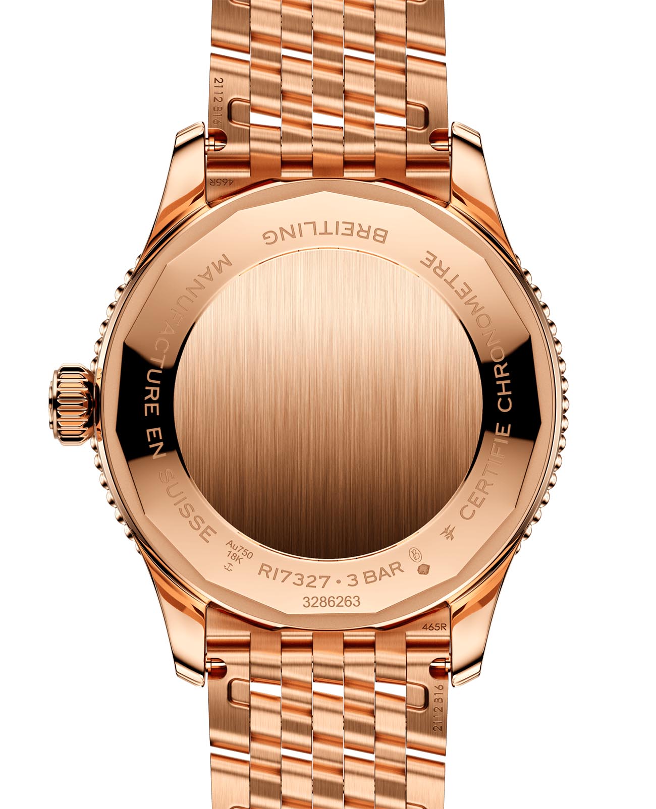 Швейцарские унисекс часы-хронометр Breitling Navitimer Automatic 36 R17327211A1R1, механический механизм (автоматический калибр) с высокой точностью. Сапфировое стеклоСапфировое стеклоПрочный и надёжный материал из кристалла сапфира синтетического происхождения, характеризующийся особой твёрдостью и устойчивостью к царапинам и повреждениям. устойчивое к появлению царапин, обладающее высокой прозрачностью. Класс водозащиты: 30 метров, позволит защитить корпус от случайных брызг или капель дождя. Корпус и браслет часов изготовлены из красного 18-каратного золота18-каратное золотоОбозначение по каратной системе пробирования, оно показывает, сколько драгоценного металла содержится в изделии. 18 карат - в составе 75% чистого золота, соответствует 750 пробе.