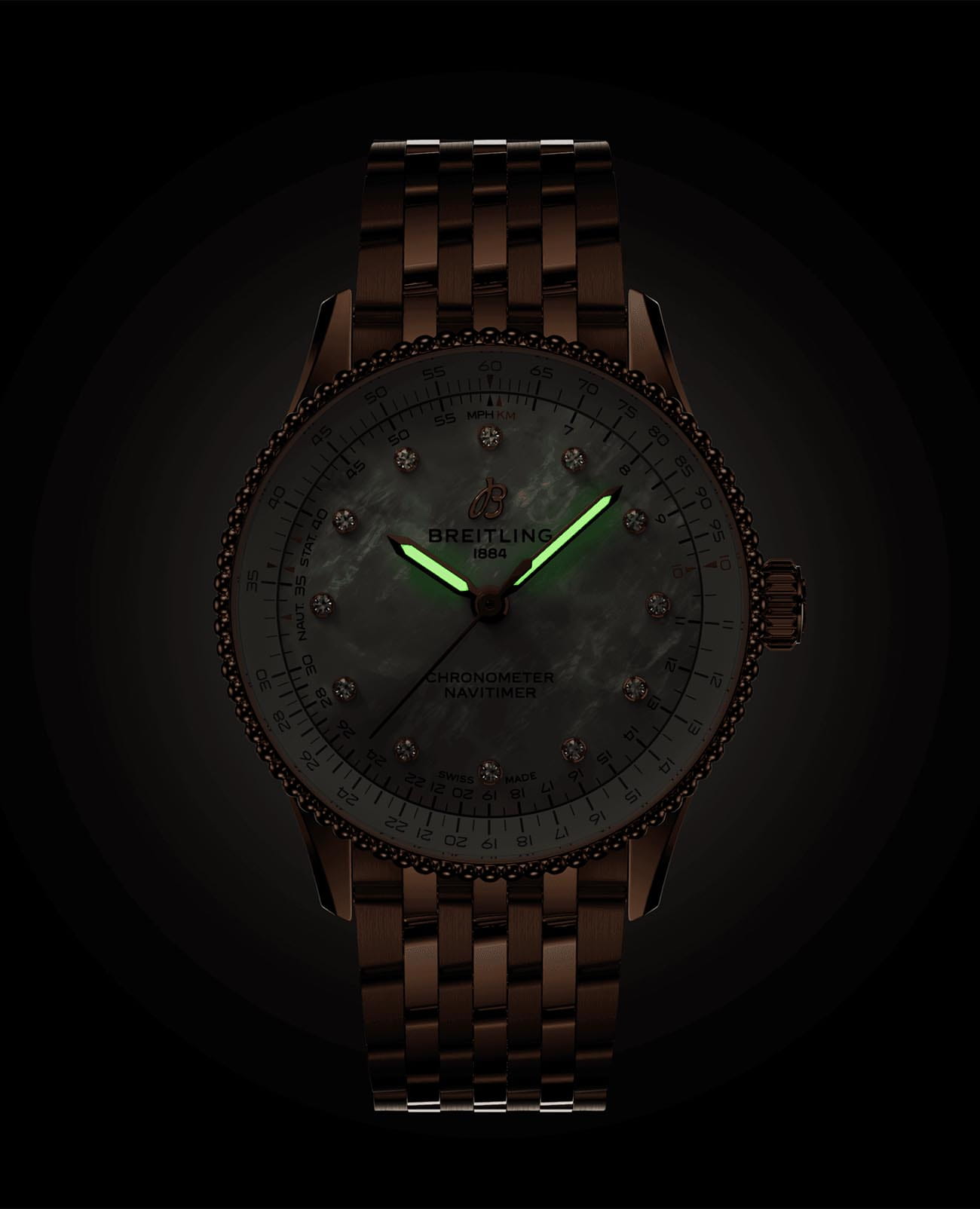 . Браслет на застёжке-бабочке с кнопкамиЗастёжка "бабочка"Такой вид застёжки дополняется предохранителями, помогающими избежать случайного раскрытия браслета. Обладают изящным исполнением. . Стрелки с люминесцентным покрытиемЛюминесцентное покрытиеПозволяет считывать показания времени в темноте. Производители наносят на стрелки, часовые индексы, безель или поверхность циферблата светонакопительный состав, дающий холодное свечение.. Циферблат украшен бриллантами. Часы оснащены логарифмической линейкой.