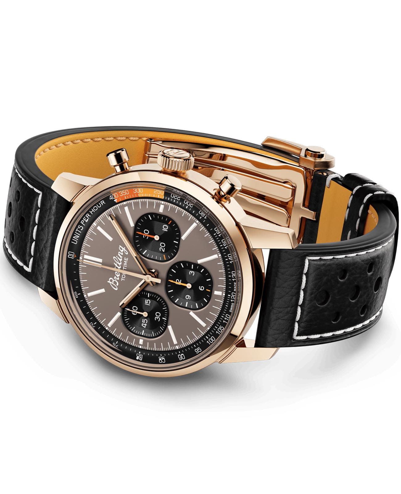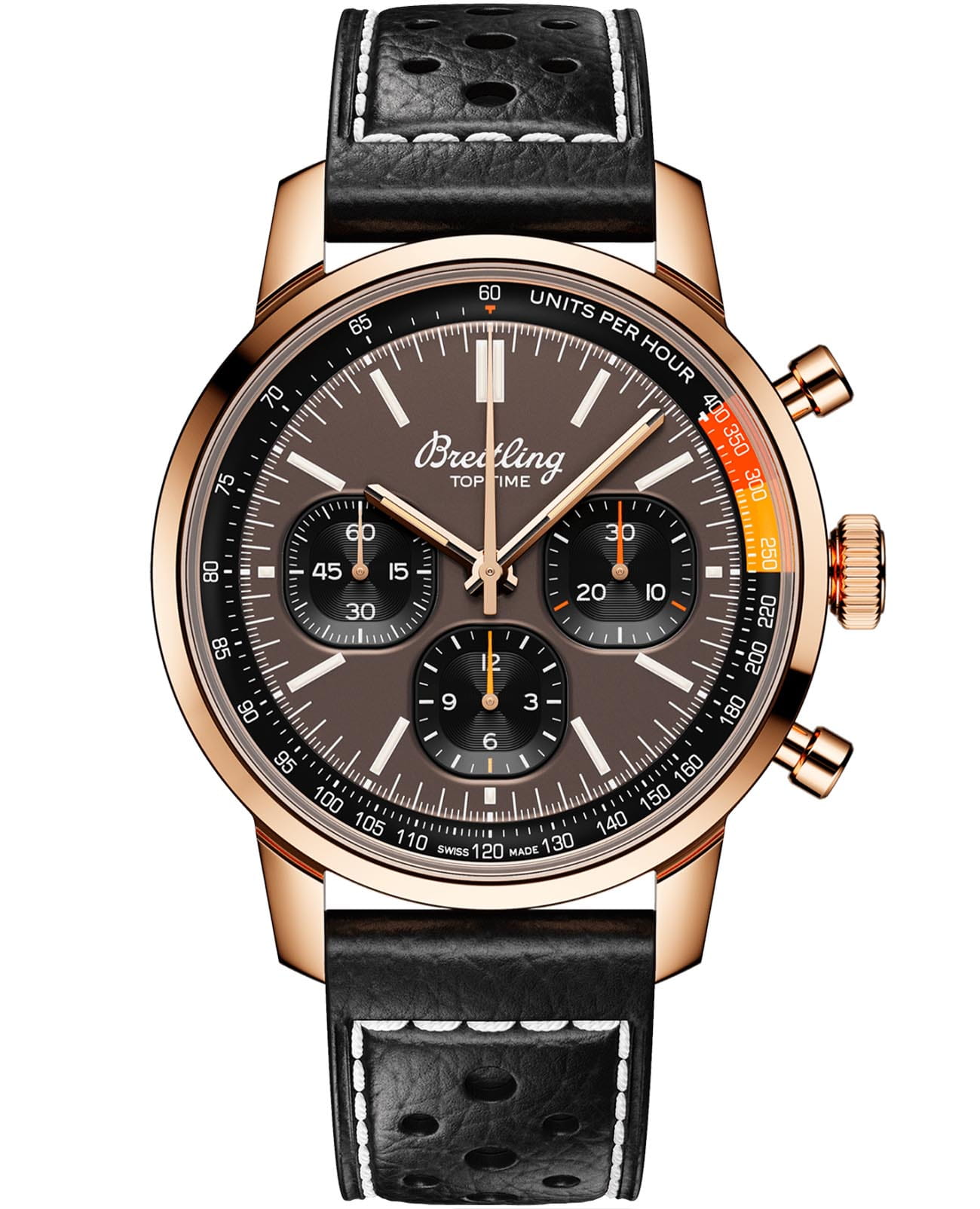 Мужские швейцарские часы-хронографХронографФункция позволяет измерять отрезки времени с особой точностью: часы, минуты, секунды. Верным признаком хронографа является наличие на циферблате 3 дополнительных окошек-счётчиков. с тахиметромТахиметрРазмеченная шкала, располагается на ободке или безеле часов. Тахиметр позволяет рассчитать скорость на определённом участке пути, расстояние измеряется в километрах или милях. Breitling Top Time B01 RB01761A1Q1X1, механический механизм (автоматический калибр) с высокой точностью. Сапфировое стеклоСапфировое стеклоПрочный и надёжный материал из кристалла сапфира синтетического происхождения, характеризующийся особой твёрдостью и устойчивостью к царапинам и повреждениям. устойчивое к появлению царапин, обладающее высокой прозрачностью. Корпус часов изготовлен из красного 18-каратного золота18-каратное золотоОбозначение по каратной системе пробирования, оно показывает, сколько драгоценного металла содержится в изделии. 18 карат - в составе 75% чистого золота, соответствует 750 пробе.