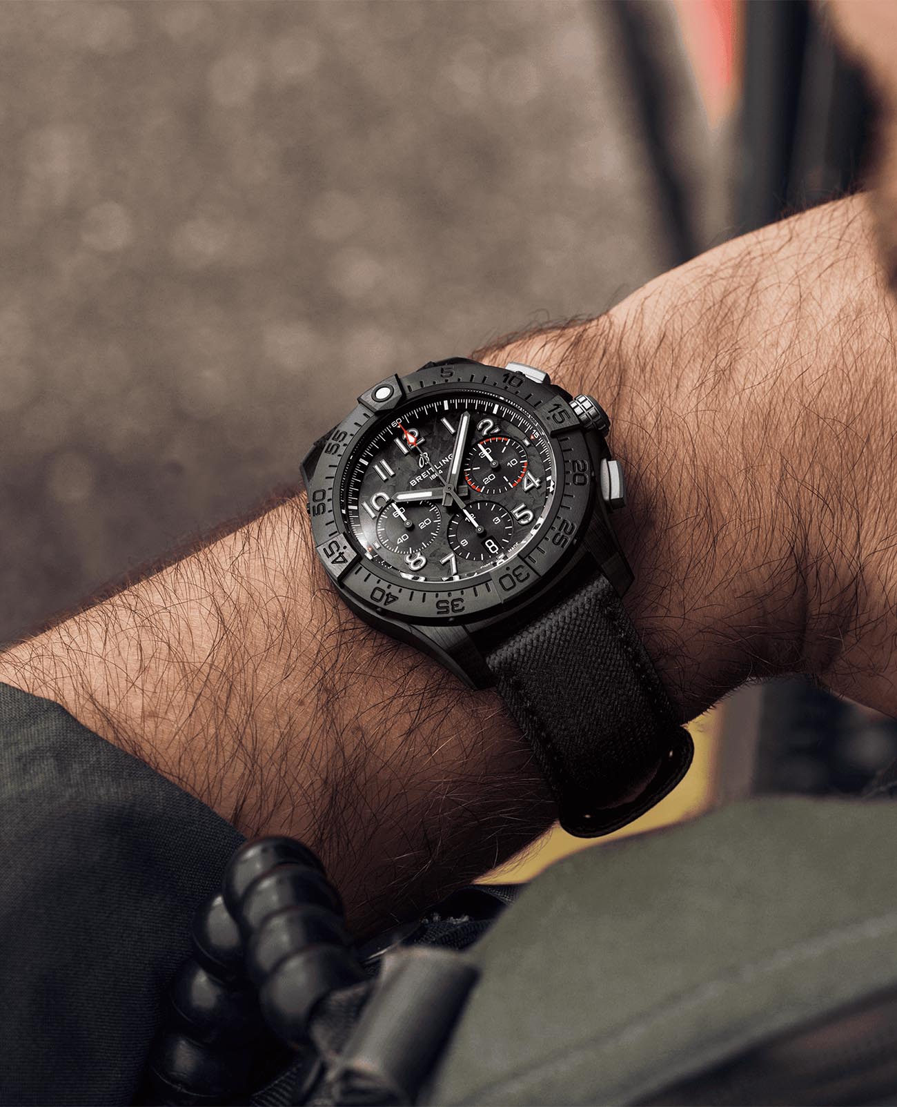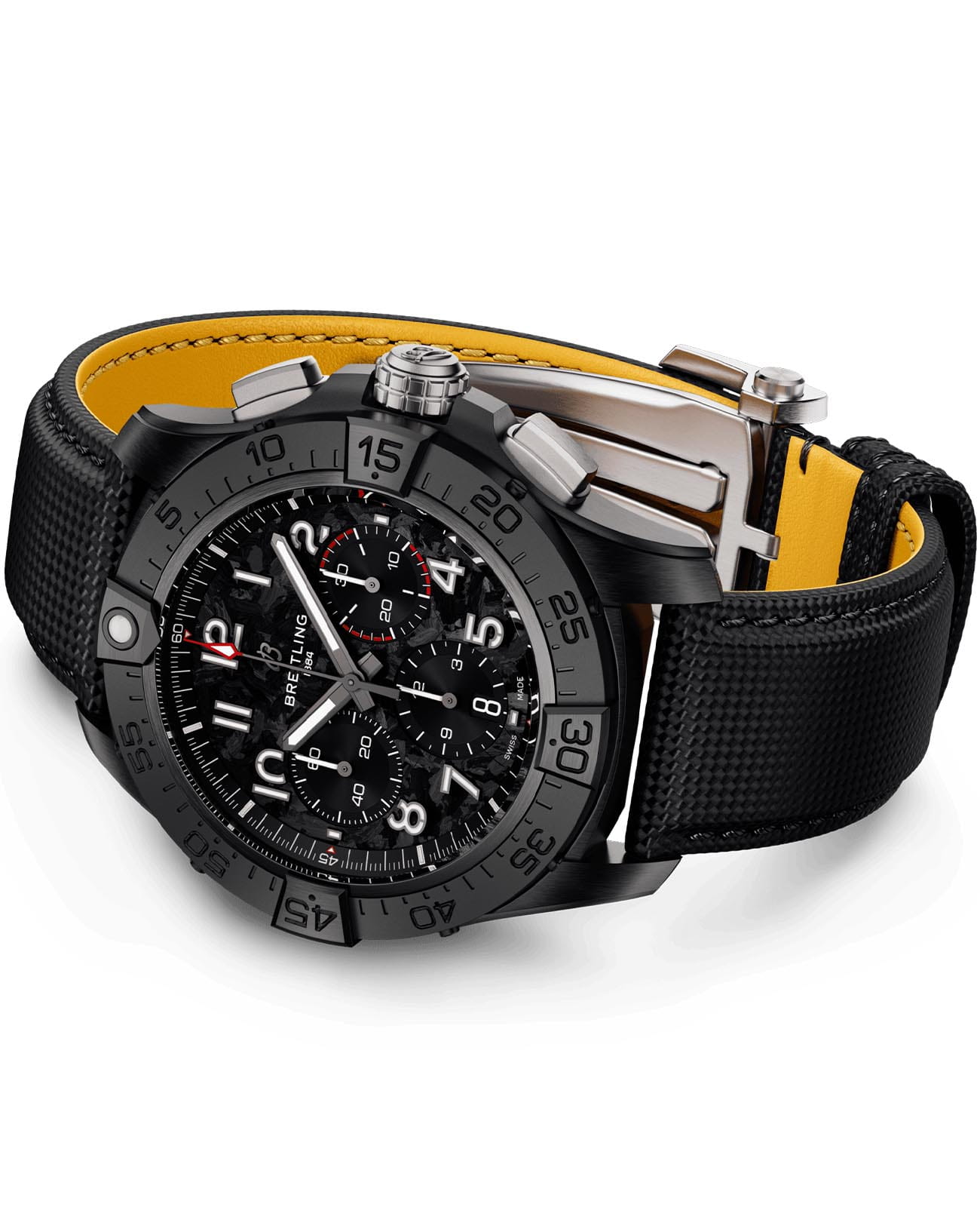 Мужские наручные часы c хронографомХронографФункция позволяет измерять отрезки времени с особой точностью: часы, минуты, секунды. Верным признаком хронографа является наличие на циферблате 3 дополнительных окошек-счётчиков. Breitling Avenger B01 Chronograph 44 Night Mission SB0147101B1X1 с надёжным автоматическим механизмом. Корпус часов изготовлен из керамики. Сапфировое стеклоСапфировое стеклоПрочный и надёжный материал из кристалла сапфира синтетического происхождения, характеризующийся особой твёрдостью и устойчивостью к царапинам и повреждениям. с антибликовым покрытием, устойчивое к мелким механическим повреждениям. Практичный кожаный ремешок на стандартной застёжке. Стрелки и метки с люминесцентным покрытиемЛюминесцентное покрытиеПозволяет считывать показания времени в темноте. Производители наносят на стрелки, часовые индексы, безель или поверхность циферблата светонакопительный состав, дающий холодное свечение.. Однонаправленный керамический безельБезельВнешний ободок, закрепляющий стекло. В спортивных часах так называется поворотное кольцо с делениями на циферблате, выполняет роль таймера – замеряет отрезки времени на шкале. Неподвижный безель – элемент декора. Однонаправленно вращающийся безель на дайверских часах позволяет фиксировать моменты погружения и выныривания на поверхность..