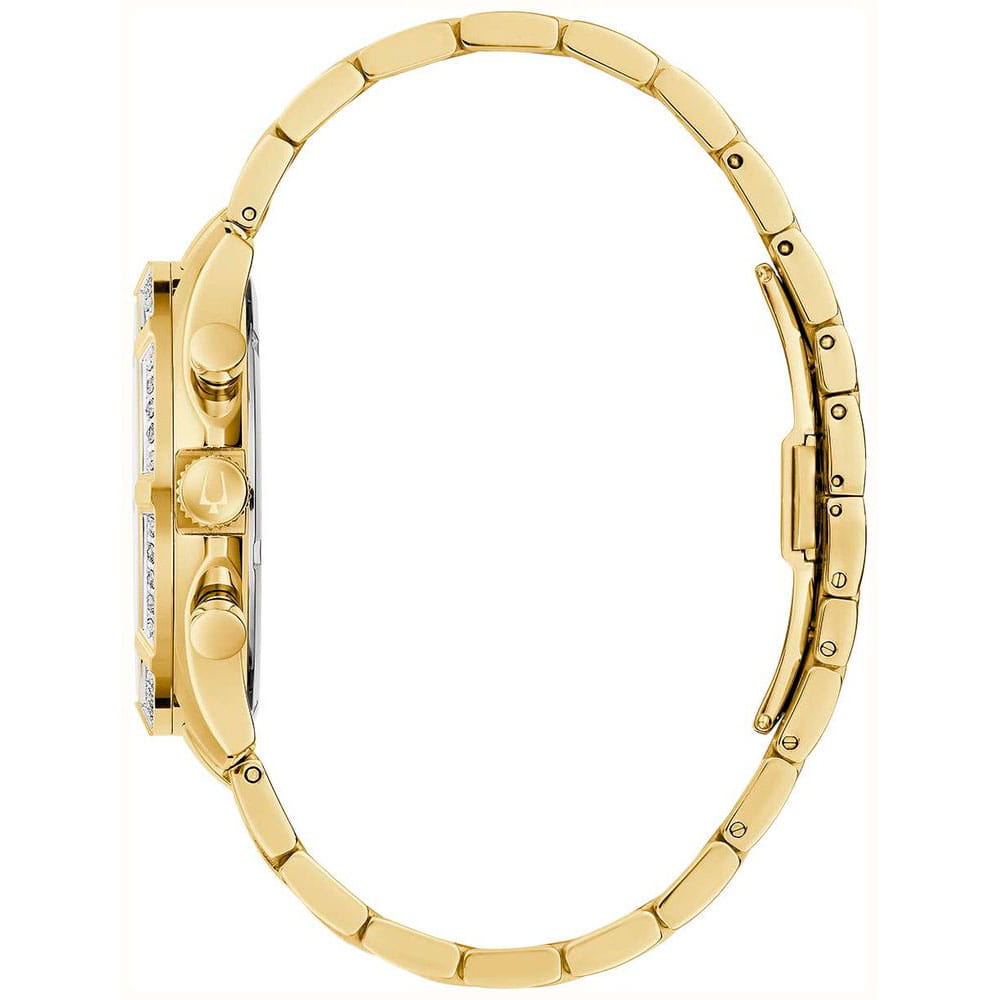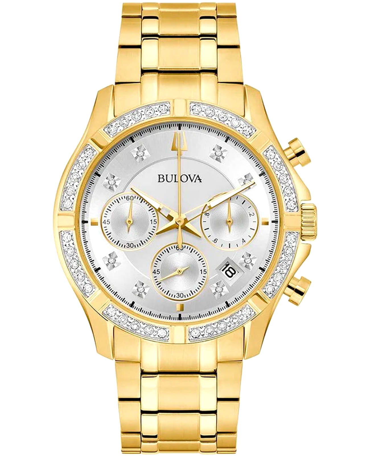 Мужские кварцевые часы-хронографХронографФункция позволяет измерять отрезки времени с особой точностью: часы, минуты, секунды. Верным признаком хронографа является наличие на циферблате 3 дополнительных окошек-счётчиков. Bulova Sutton 98E113 – отражающий идеальное сочетание современного дизайна, надёжности и функциональности. Элегантный облик станет превосходным завершением образа, наделив его индивидуальным характером. Корпус из нержавеющей стали с PVD-покрытиемPVDУльтратонкое покрытие наносится в технике вакуумного напыления, сочетает в себе нитрид титана особой прочности со слоем золота или оксида хрома. Несёт в себе декоративную или защитную функцию. золотистого цвета, диаметром 43 мм идеально сбалансирован и элегантен. Минеральное стеклоМинеральное стеклоМинеральное стекло представляет собой искусственно выращенный минерал кварца. Такое стекло отличается особой устойчивостью к повреждениям и царапинам. Уступает по некоторым качествам сапфировому стеклу. защищает циферблат от царапин и устойчивое к мелким механическим повреждениям. Апертура даты между 4 и 5 часами. Секундомер. Стальной браслет с PVD-покрытиемPVDУльтратонкое покрытие наносится в технике вакуумного напыления, сочетает в себе нитрид титана особой прочности со слоем золота или оксида хрома. Несёт в себе декоративную или защитную функцию. на застёжке-бабочке с кнопкамиЗастёжка "бабочка"Такой вид застёжки дополняется предохранителями, помогающими избежать случайного раскрытия браслета. Обладают изящным исполнением. обеспечивает комфортное ношение. Неподвижный безельБезельВнешний ободок, закрепляющий стекло. В спортивных часах так называется поворотное кольцо с делениями на циферблате, выполняет роль таймера – замеряет отрезки времени на шкале. Неподвижный безель – элемент декора. Однонаправленно вращающийся безель на дайверских часах позволяет фиксировать моменты погружения и выныривания на поверхность. украшен бриллиантами. Водозащита 30 метров позволит защитить корпус от случайных брызг или капель дождя. Стрелки с люминесцентным покрытиемЛюминесцентное покрытиеПозволяет считывать показания времени в темноте. Производители наносят на стрелки, часовые индексы, безель или поверхность циферблата светонакопительный состав, дающий холодное свечение. позволяющие легко определять время даже в темноте. Эта модель – отличный выбор для тех, кто ищет сочетание стиля, качества и функциональности. Часы станут не только полезным аксессуаром, но и выразительным элементом вашего имиджа.