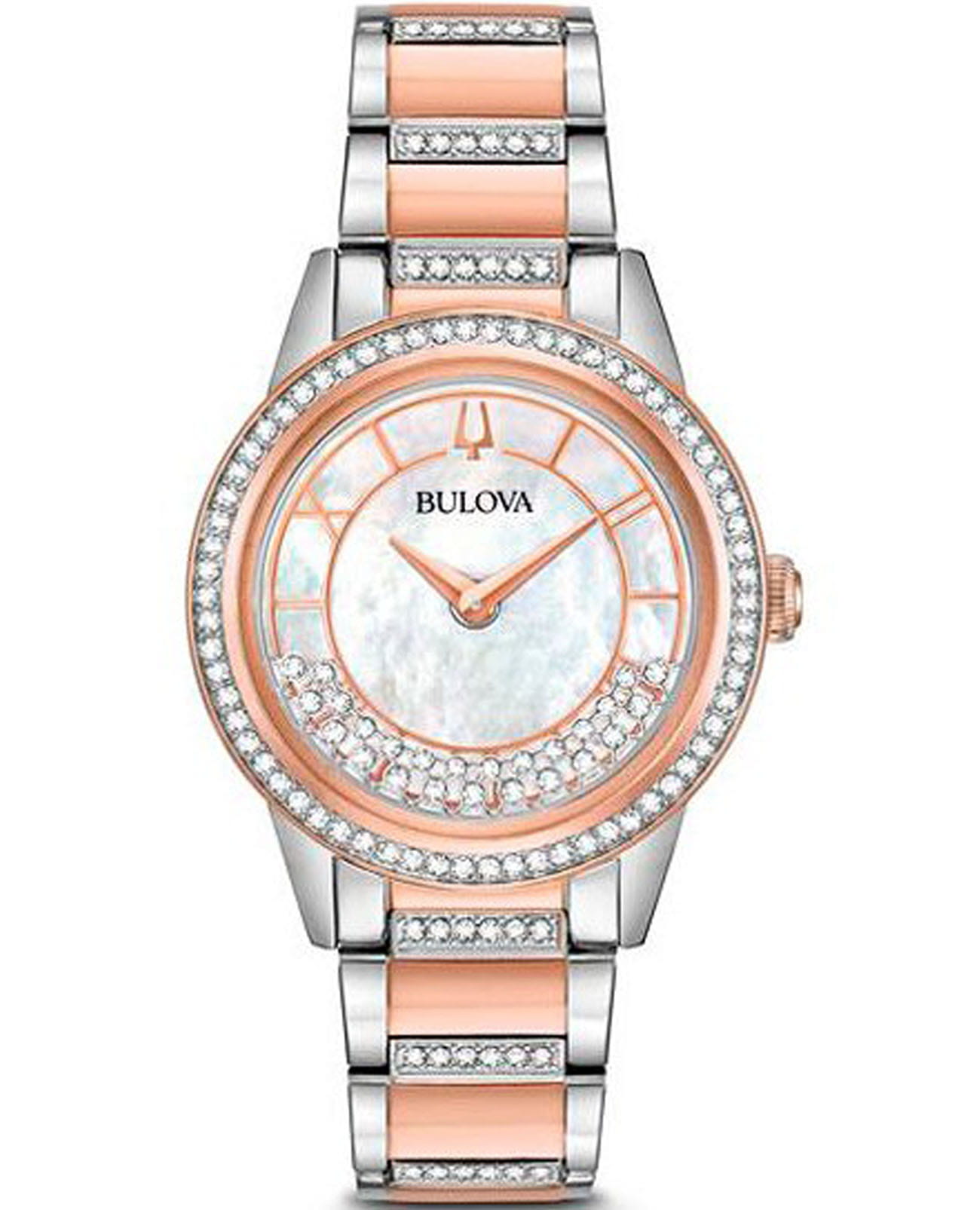 Женские кварцевые часы Bulova Crystal Ladies 98L246 – отражающий идеальное сочетание современного дизайна, надёжности и функциональности. Элегантный облик станет превосходным завершением образа, наделив его индивидуальным характером. Корпус из нержавеющей стали, диаметром 33 мм идеально сбалансирован и элегантен. Минеральное стеклоМинеральное стеклоМинеральное стекло представляет собой искусственно выращенный минерал кварца. Такое стекло отличается особой устойчивостью к повреждениям и царапинам. Уступает по некоторым качествам сапфировому стеклу. защищает циферблат от царапин и устойчивое к мелким механическим повреждениям. БезельБезельВнешний ободок, закрепляющий стекло. В спортивных часах так называется поворотное кольцо с делениями на циферблате, выполняет роль таймера – замеряет отрезки времени на шкале. Неподвижный безель – элемент декора. Однонаправленно вращающийся безель на дайверских часах позволяет фиксировать моменты погружения и выныривания на поверхность. с IP-покрытиемIP-покрытиеМетод ионного напыления. Демонстрирует повышенную устойчивость к истиранию, окислению и химическим веществам. Под воздействием высокого давления и температуры около 1500°C молекулы металла надёжно соединяются с частицами корпуса часов., браслет и циферблат украшены кристаллами Swarovski. Стальной браслет с IP-покрытиемIP-покрытиеМетод ионного напыления. Демонстрирует повышенную устойчивость к истиранию, окислению и химическим веществам. Под воздействием высокого давления и температуры около 1500°C молекулы металла надёжно соединяются с частицами корпуса часов. а застёжке-бабочке с кнопкамиЗастёжка "бабочка"Такой вид застёжки дополняется предохранителями, помогающими избежать случайного раскрытия браслета. Обладают изящным исполнением.  обеспечивает комфортное ношение. Водозащита 30 метров позволит защитить корпус от случайных брызг или капель дождя. Эта модель – отличный выбор для тех, кто ищет сочетание стиля, качества и функциональности. Часы станут не только полезным аксессуаром, но и выразительным элементом вашего имиджа.