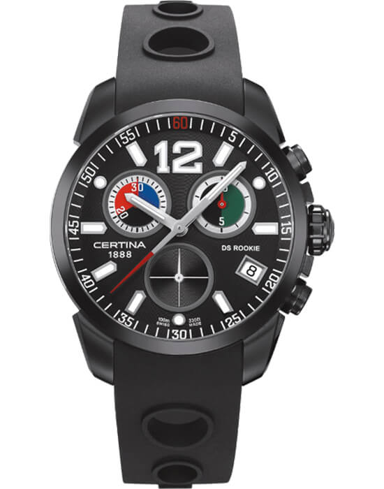 ХронографХронографФункция позволяет измерять отрезки времени с особой точностью: часы, минуты, секунды. Верным признаком хронографа является наличие на циферблате 3 дополнительных окошек-счётчиков. с каучуковым ремешком основан на концепции Double SecurityDS ConceptDouble Security Concept, обозначает двойную надёжность и безупречную точность часов Certina. Двойная система защиты подразумевает обеспечение максимальной устойчивости к ударам и высоких показателей водонепроницаемости.. Ударопрочный корпусУдаропрочный корпусМеханизм заключён в корпус, выполненный из современных материалов, устойчивых к ударам, механическим повреждениям и падению с высоты: инновационный пластик, карбон, нержавеющая сталь, титан. с PVD-покрытиемPVDУльтратонкое покрытие наносится в технике вакуумного напыления, сочетает в себе нитрид титана особой прочности со слоем золота или оксида хрома. Несёт в себе декоративную или защитную функцию. защищает швейцарский кварцевый механизм ETA G10.211. Люминесцентная подсветкаЛюминесцентное покрытиеПозволяет считывать показания времени в темноте. Производители наносят на стрелки, часовые индексы, безель или поверхность циферблата светонакопительный состав, дающий холодное свечение. стрелок позволяет пользоваться часами в темноте. Сапфировое стекло невозможно поцарапать.