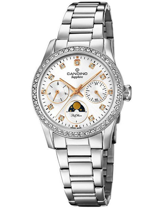 Женские швейцарские часы с сапфировым стеклом Candino Chronograph C4686/1, кварцевый механизм с высокой точностью. Сапфировое стекло устойчивое к появлению царапин, обладающее высокой прозрачностью. Класс водозащиты: 50 метров, позволит защитить корпус от случайных брызг или капель дождя. Корпус часов изготовлен из стали, серебристого цвета.