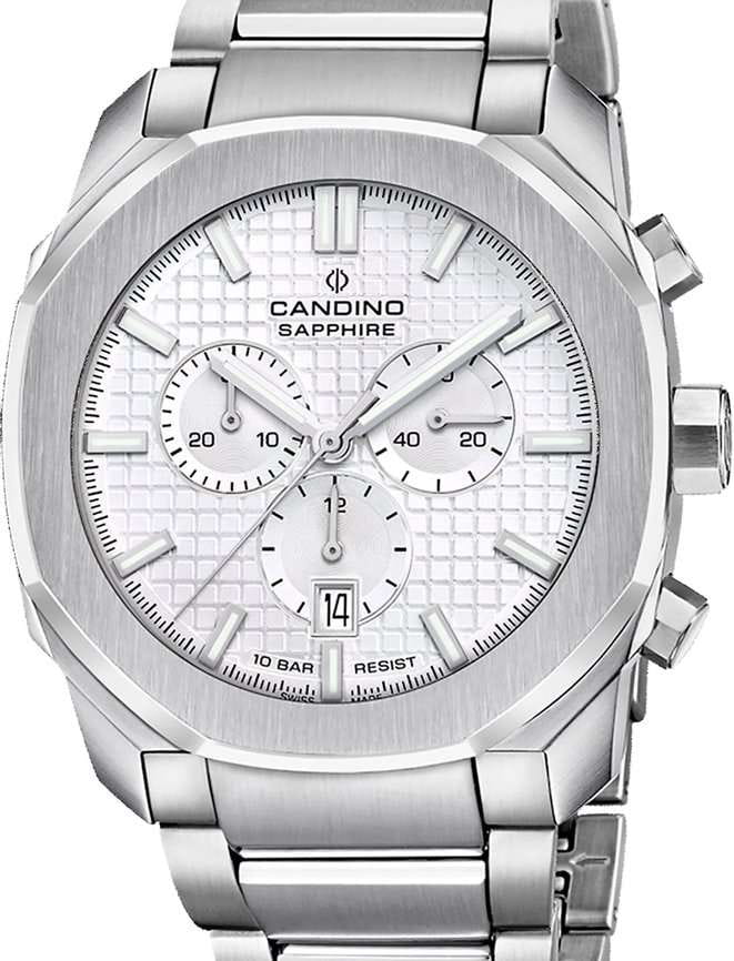 Мужские наручные часы-хронографХронографФункция позволяет измерять отрезки времени с особой точностью: часы, минуты, секунды. Верным признаком хронографа является наличие на циферблате 3 дополнительных окошек-счётчиков. Candino C4746/5 из коллекции Chronos Carree сочетают в себе современный дизайн и надежность швейцарского качества. Модель обладает круглым корпусом, выполненным из высококачественной нержавеющей стали, что обеспечивает устойчивость к коррозии и внешним воздействиям . Для защиты циферблата используется сапфировое стеклоСапфировое стеклоПрочный и надёжный материал из кристалла сапфира синтетического происхождения, характеризующийся особой твёрдостью и устойчивостью к царапинам и повреждениям., известное своей прочностью и устойчивостью к царапинам . Часы оснащены кварцевым механизмом, гарантирующим высокую точность хода без необходимости дополнительного обслуживания . Циферблат украшен узором гильоше, сочетающим геометрические и радиальные элементы, что придает модели элегантный вид. Браслет изготовлен из нержавеющей стали с раскладной застежкойРаскладная застёжкаТакой тип застёжки используется только на браслетах из металла. Она никогда не раскрывается полностью, происходит разделение на 2 и более частей. Раскладывающая застёжка снизит вероятность потери часов к минимуму., обеспечивающей комфортное ношение и безопасность . Модель также оснащена функцией секундомераСекундомерСекундоме́р — прибор, способный измерять интервалы времени с точностью до долей секунды., что делает её идеальной для активного образа жизни . Водонепроницаемость часов составляет 10 атмосфер (100 метров), что позволяет использовать их во время плавания и других водных видов спорта . Часы подходят для повседневной носки, сохраняя стиль и функциональность.