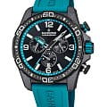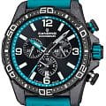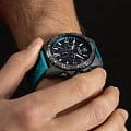 Корпус часов изготовлен из карбона, что придаёт им прочность и долговечность. Класс водозащиты 100 метров позволяет носить часы в условиях активного водного спорта, включая плавание, ныряние и другие водные виды спорта. Каучуковый ремешок на стандартной застёжке обеспечивает комфортное и надёжное крепление на запяте. Стрелки и метки с люминесцентным покрытиемЛюминесцентное покрытиеПозволяет считывать показания времени в темноте. Производители наносят на стрелки, часовые индексы, безель или поверхность циферблата светонакопительный состав, дающий холодное свечение.. Окошко даты находится в положении 6 часов.