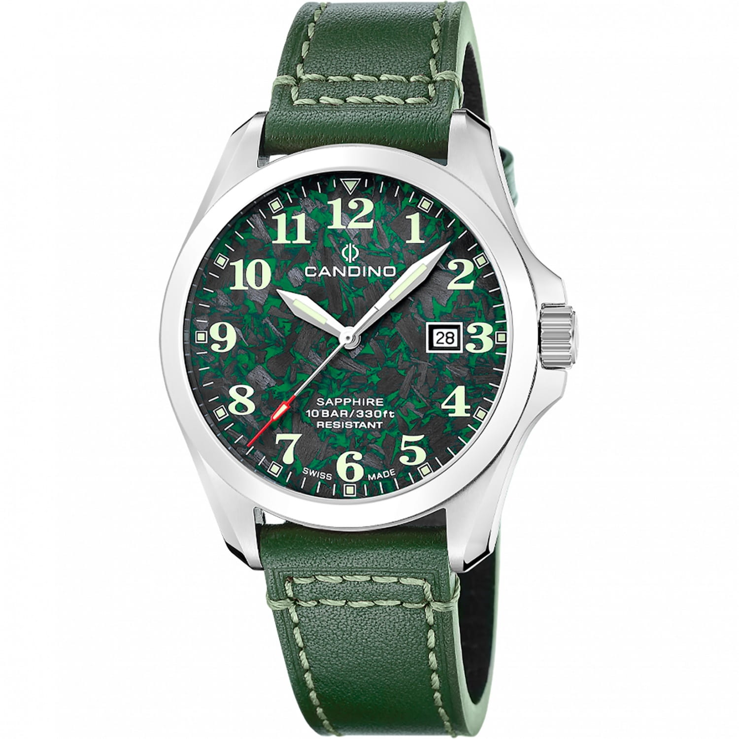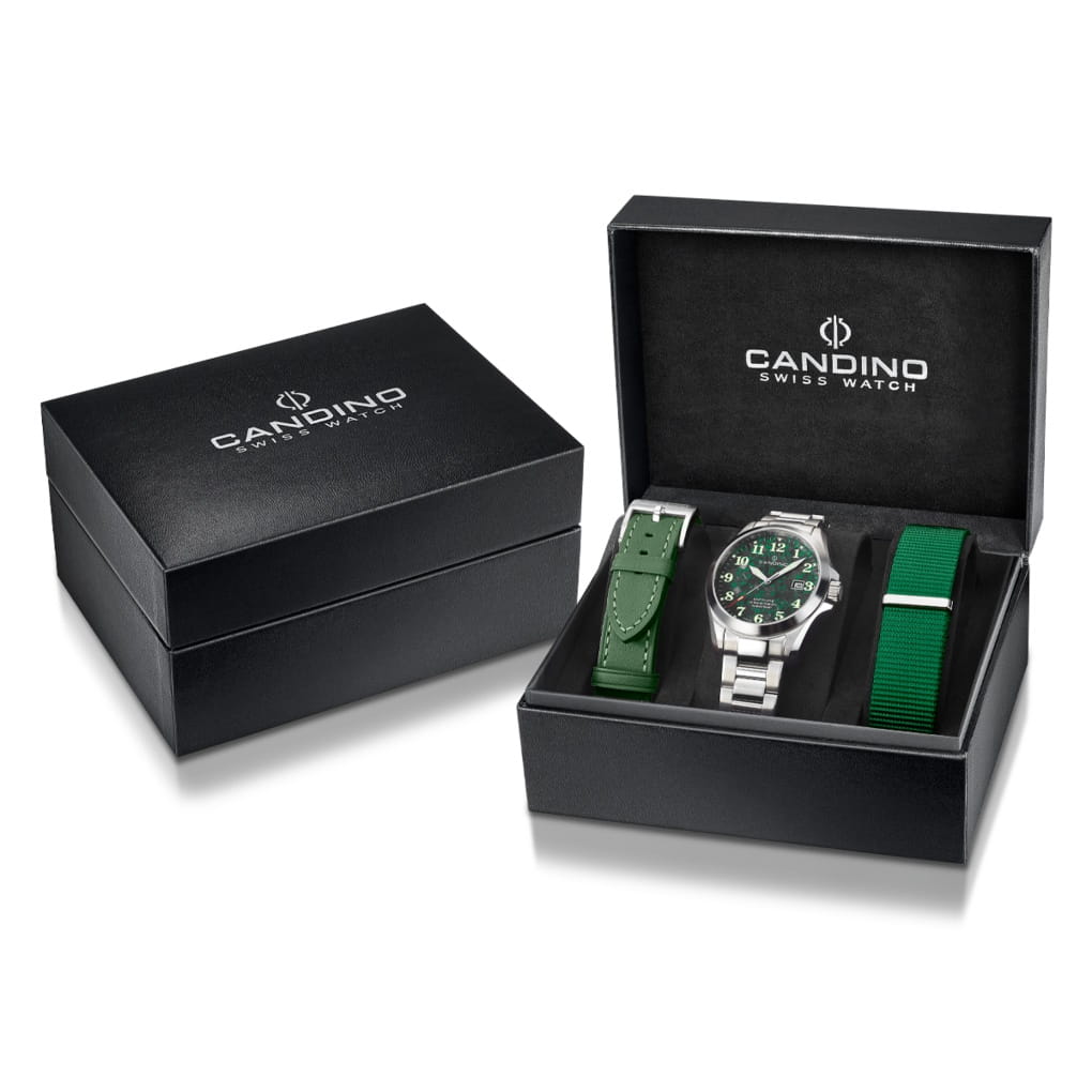 Мужские кварцевые часы Candino C4785/3 — это стильный и надёжный аксессуар швейцарского производства, сочетающий элегантность и функциональность. Корпус круглой формы выполнен из нержавеющей стали и защищён сапфировым стекломСапфировое стеклоПрочный и надёжный материал из кристалла сапфира синтетического происхождения, характеризующийся особой твёрдостью и устойчивостью к царапинам и повреждениям., устойчивым к царапинам. Циферблат зелёного цвета оформлен штрихами в качестве индикации, а стрелки и метки оснащены люминесцентным покрытиемЛюминесцентное покрытиеПозволяет считывать показания времени в темноте. Производители наносят на стрелки, часовые индексы, безель или поверхность циферблата светонакопительный состав, дающий холодное свечение., обеспечивающим хорошую читаемость в темноте. Окошко даты расположено на отметке 3 часа, что делает часы практичными в повседневном использовании. Браслет из нержавеющей стали фиксируется на раскладной застёжкеРаскладная застёжкаТакой тип застёжки используется только на браслетах из металла. Она никогда не раскрывается полностью, происходит разделение на 2 и более частей. Раскладывающая застёжка снизит вероятность потери часов к минимуму., обеспечивая удобство и надёжность ношения. Водонепроницаемость 50 м позволяет использовать часы в повседневных условиях, защищая от случайных брызг и капель дождя. Модель подчёркивает индивидуальность и хороший вкус владельца, оставаясь универсальным выбором для любого образа. В комплекте предусмотрены два ремешка из кожи и текстиля.