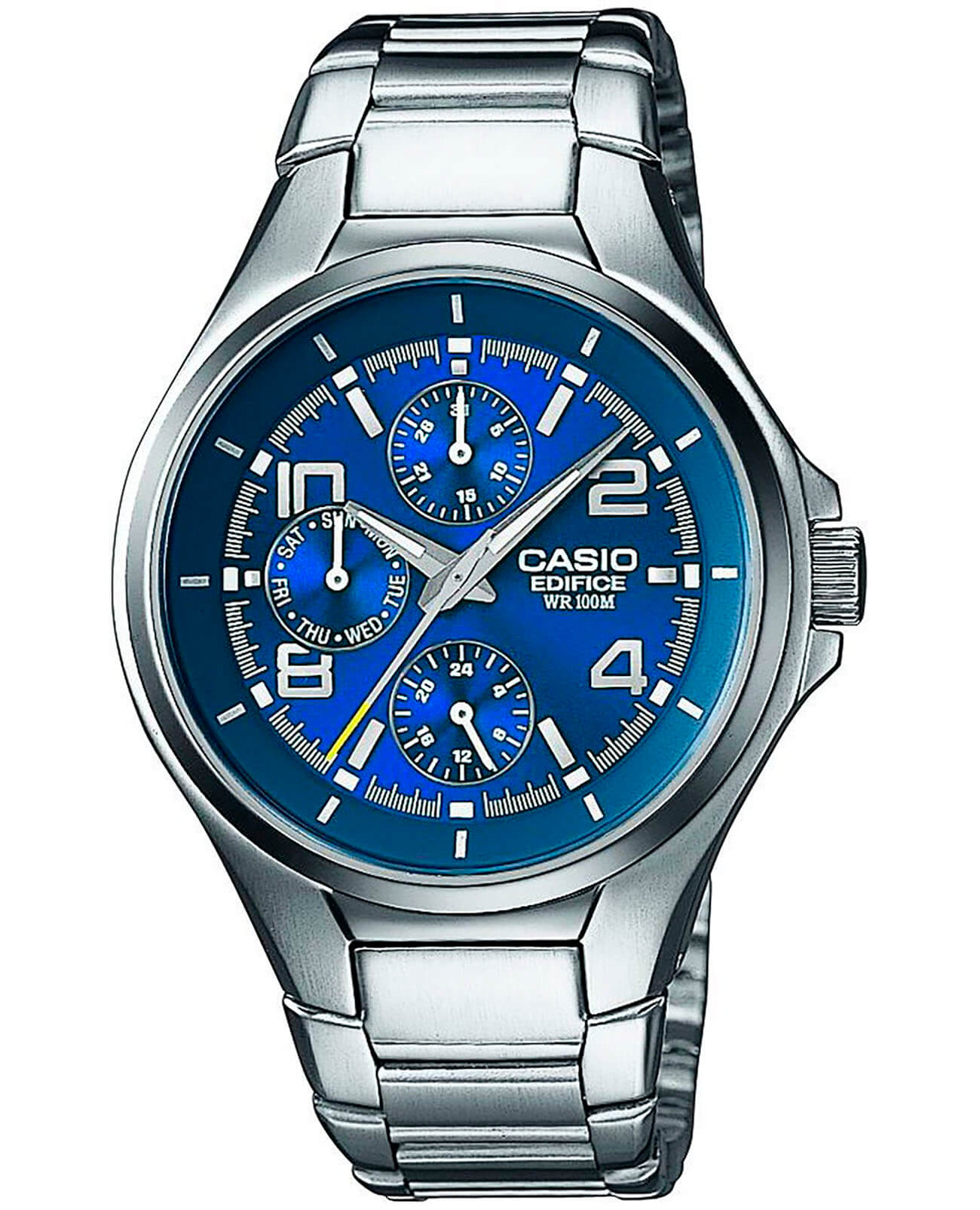 Спортивный стиль сохраняет лидирующие позиции не первый год, брендовый аксессуар позволит вам всегда быть в тренде. Синий циферблат, дополненный миниатюрными счётчиками, имеет цветовой акцент в виде жёлтого наконечника секундной стрелки. Кварцевый высокоточный механизм работает от батареи, рассчитанной на 2 года. Сохранение водостойкости до 100 метров. Прочный корпус из хирургической стали 316L. Люминесцентная подсветкаЛюминесцентное покрытиеПозволяет считывать показания времени в темноте. Производители наносят на стрелки, часовые индексы, безель или поверхность циферблата светонакопительный состав, дающий холодное свечение.. Отображение числа и дня недели. Минеральное стекло. Габариты: 48 x 40,5 x 9 мм.