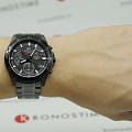 Наручные часы в чёрном цвете - максимум комфорта и качества, модель станет главной особенностью вашего образа. Прослеживается автомобильная тематика, каждая деталь тщательно продумана. Кварцевый механизм с точностью хода +/- 20 секунд в месяц работает от батарейки, рассчитанной на 3 года работы. Минеральное стекло. Противоударный корпусУдаропрочный корпусМеханизм заключён в корпус, выполненный из современных материалов, устойчивых к ударам, механическим повреждениям и падению с высоты: инновационный пластик, карбон, нержавеющая сталь, титан. и браслет из нержавеющей стали 316L. Водостойкость до 10 бар. Чёрное IP-покрытиеIP-покрытиеМетод ионного напыления. Демонстрирует повышенную устойчивость к истиранию, окислению и химическим веществам. Под воздействием высокого давления и температуры около 1500°C молекулы металла надёжно соединяются с частицами корпуса часов.. Закручивающаяся задняя крышка. Люминесцентная подсветкаЛюминесцентное покрытиеПозволяет считывать показания времени в темноте. Производители наносят на стрелки, часовые индексы, безель или поверхность циферблата светонакопительный состав, дающий холодное свечение.. Секундомер, хронографХронографФункция позволяет измерять отрезки времени с особой точностью: часы, минуты, секунды. Верным признаком хронографа является наличие на циферблате 3 дополнительных окошек-счётчиков., окошко даты. Габариты: 43,8 x 48,5 x 12,1 мм.