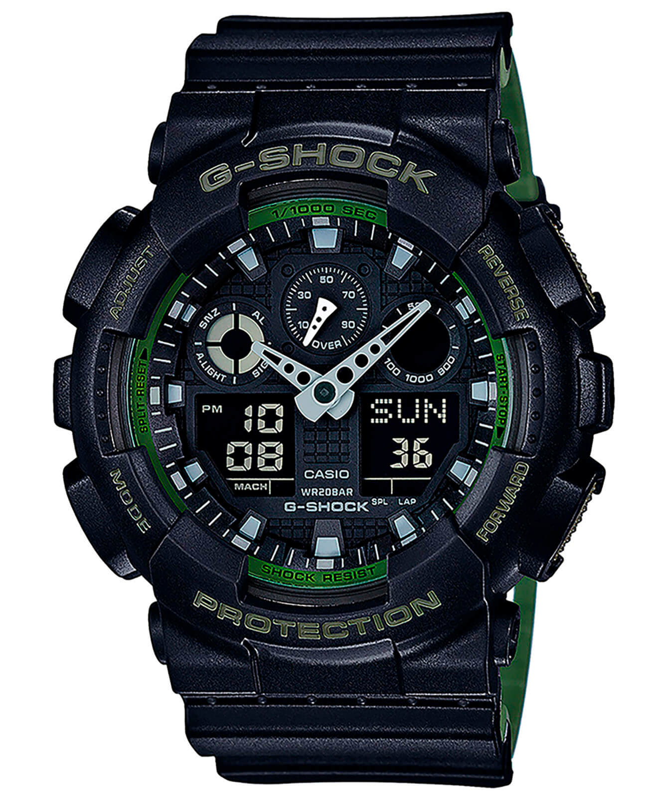 Часы в чёрном исполнении подойдут к любой одежде, оригинально смотрятся тёмно-зелёные детали и контрастные перфорированные стрелки. Аксессуар "Three-eye" с 3 характерными счётчиками в верхней части отличаются противоударным корпусомУдаропрочный корпусМеханизм заключён в корпус, выполненный из современных материалов, устойчивых к ударам, механическим повреждениям и падению с высоты: инновационный пластик, карбон, нержавеющая сталь, титан., выдерживающим максимальные нагрузки. Японский кварцевый калибр с точностью хода +/- 15 секунд в месяц. Срок службы батарейки составляет 3 года. Минеральное стекло устойчиво к царапинам. Минимизация влияния магнитного поля. Водонепроницаемость 200 метров. Дополнения: будильник с возможностью повтора, расчёт средней скорости по пройденному маршруту, таймер обратного отсчёта, хронографХронографФункция позволяет измерять отрезки времени с особой точностью: часы, минуты, секунды. Верным признаком хронографа является наличие на циферблате 3 дополнительных окошек-счётчиков., автоматический календарь до 2099 года, мировое времяМировое время Полезное часовое усложнение, отображающее время в основных городах и известных областях по всему миру, оно связано с часовыми поясами, удобно для путешественников и бизнесменов. , секундомер. Габариты: 55 x 51,2 x 16,9 мм.