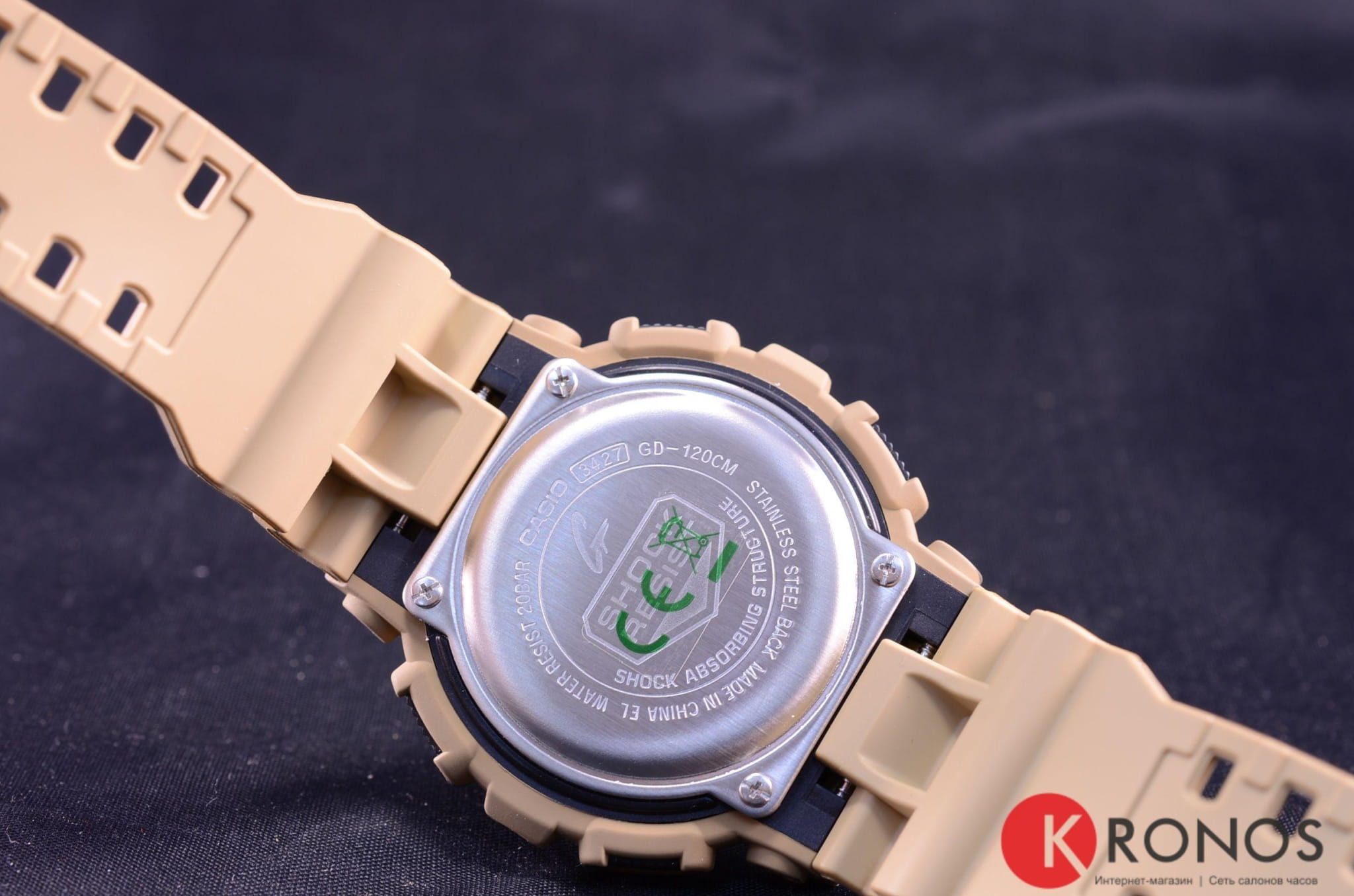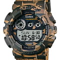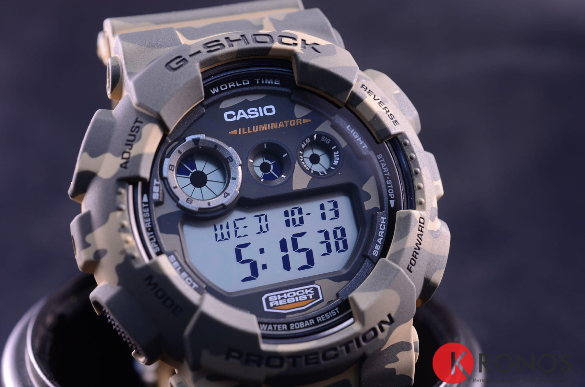 Наручные часы обладают внушительными размерами, благодаря массивному ударопрочному корпусуУдаропрочный корпусМеханизм заключён в корпус, выполненный из современных материалов, устойчивых к ударам, механическим повреждениям и падению с высоты: инновационный пластик, карбон, нержавеющая сталь, титан. и необычному дизайну они приметно смотрятся на запястье. Их поверхность имеет камуфляжный принт в песочно-болотной расцветке, циферблат же оставлен в минималистичном исполнении. Японский кварцевый механизм работает за счёт батарейки, срок службы которой составляет 7 лет. Корпус и браслет из высокопрочного пластика. Автоматическая светодиодная подсветкаСветодиодная подсветкаСветодиодная или LED-подсветка обеспечивает появление яркого холодного свечения за счёт LED-элементов - маленьких лампочек. Они потребляют минимальное количество энергии, чаще всего можно встретить 1 светодиод, в нижней части циферблата.. Закаленное минеральное стекло. Водозащита 200 метров. Включение и выключение функции кнопок. Функции: таймер обратного отсчёта, 5 будильников, хронографХронографФункция позволяет измерять отрезки времени с особой точностью: часы, минуты, секунды. Верным признаком хронографа является наличие на циферблате 3 дополнительных окошек-счётчиков., секундомер, мировое времяМировое время Полезное часовое усложнение, отображающее время в основных городах и известных областях по всему миру, оно связано с часовыми поясами, удобно для путешественников и бизнесменов. . Габариты: 55 x 51,2 x 17,4 мм.