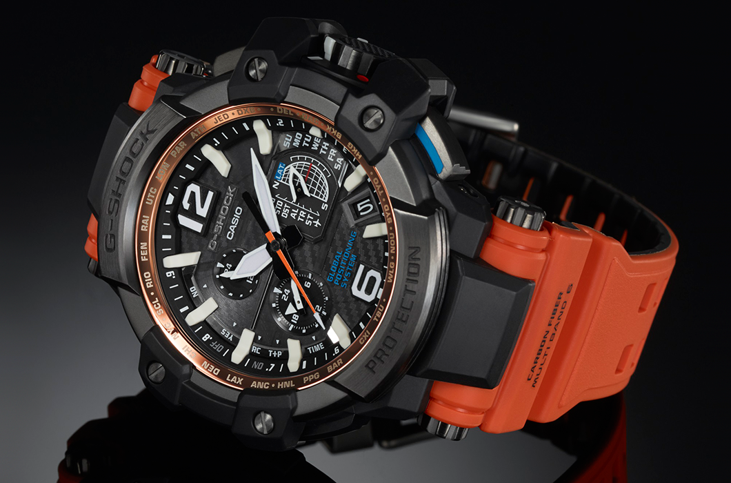 Флагманская модель с ярким карбоновым ремешком из серии G-SHOCK GPW — это первые в мире часы с GPS- и радио-синхронизацией времени с атомными часами в разных частях света.