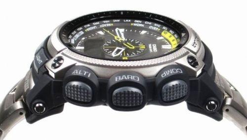 Многофункциональные часы с противоударной конструкцией и хорошей водозащитой. Часы работают на солнечных элементах. Cветодиодная подсветка автоматически включается при тусклом, темном свете и отключается при хорошем освещении. Часы рассчитаны на работу при температуре ниже нуля. В режиме "Мировое время" можно просмотреть местное время в некоторых основных городах и определенных регионах мира. В режиме Секундомера можно фиксировать отдельные отрезки времени с точностью показаний 1/100 сек и временем измерения 24 часа. Часы оснащены цифровым компасом, альтиметром, барометром, датчиком температуры. Альтиметр – датчик барометрического давления с выводом результата в единицах высоты над уровнем моря. Максимальная высота измерения – 10000 метров над уровнем моря. Индикатор уровня заряда элемента питания. Календарь автоматический: автоматически учитываются месяцы разной продолжительности и високосные годы. Габаритные размеры - 56,8х49,3х14,3. Вес 113г.