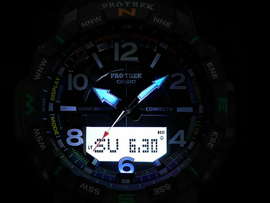 , будильник, хронографХронографФункция позволяет измерять отрезки времени с особой точностью: часы, минуты, секунды. Верным признаком хронографа является наличие на циферблате 3 дополнительных окошек-счётчиков., поиск телефона. Часы синхронизируются со смартфоном с помощью технологии Bluetooth® SmartBluetoothСовременная технология, позволяющая синхронизировать часы с телефоном и переносить данные. Часы с Bluetooth расширяют возможности вашего смартфона и делают его использование ещё более удобным.. Японский кварцевый механизм. Срок службы батарейки – 2 года. Минеральное стекло. Двойная электролюминесцентная подсветкаЭлектролюминесцентная подсветкаЭлектролюминесцентная панель устанавливается под ЖК-экраном часов, при нажатии кнопки электричество преобразуется в свет за счёт подачи напряжения на атомы фосфора, такой тип подсветки позволяет освещать весь циферблат.. Отключение и включение звука кнопок. Сохранение работоспособности при температуре ниже -10°C. Водозащита 100 метров. Ударопрочный корпусУдаропрочный корпусМеханизм заключён в корпус, выполненный из современных материалов, устойчивых к ударам, механическим повреждениям и падению с высоты: инновационный пластик, карбон, нержавеющая сталь, титан. и ремешок из полимерного материала. Габариты: 57,5 x 50,8 x 15,8 мм.