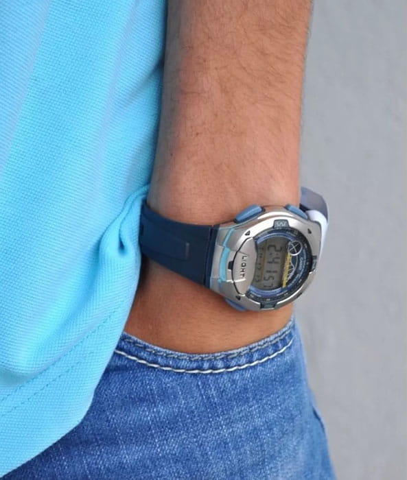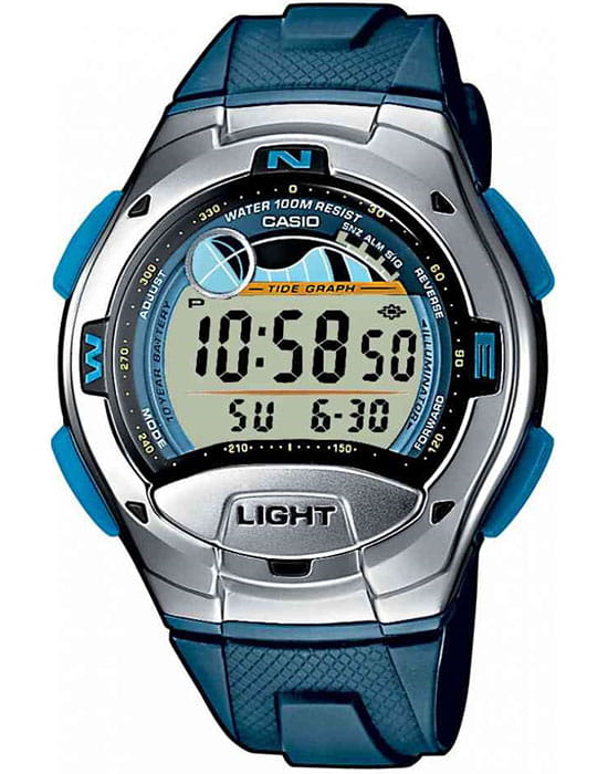Данная модель от Casio идеально подойдет для любителей активного отдыха. На прочном корпусе имеются аккуратные отметки сторон света. На экране отображаются фазы луны. Есть датчик приливов и отливов. Вставлен вращающийся безельБезельВнешний ободок, закрепляющий стекло. В спортивных часах так называется поворотное кольцо с делениями на циферблате, выполняет роль таймера – замеряет отрезки времени на шкале. Неподвижный безель – элемент декора. Однонаправленно вращающийся безель на дайверских часах позволяет фиксировать моменты погружения и выныривания на поверхность.. Долговечная батарейка служит 10 лет.