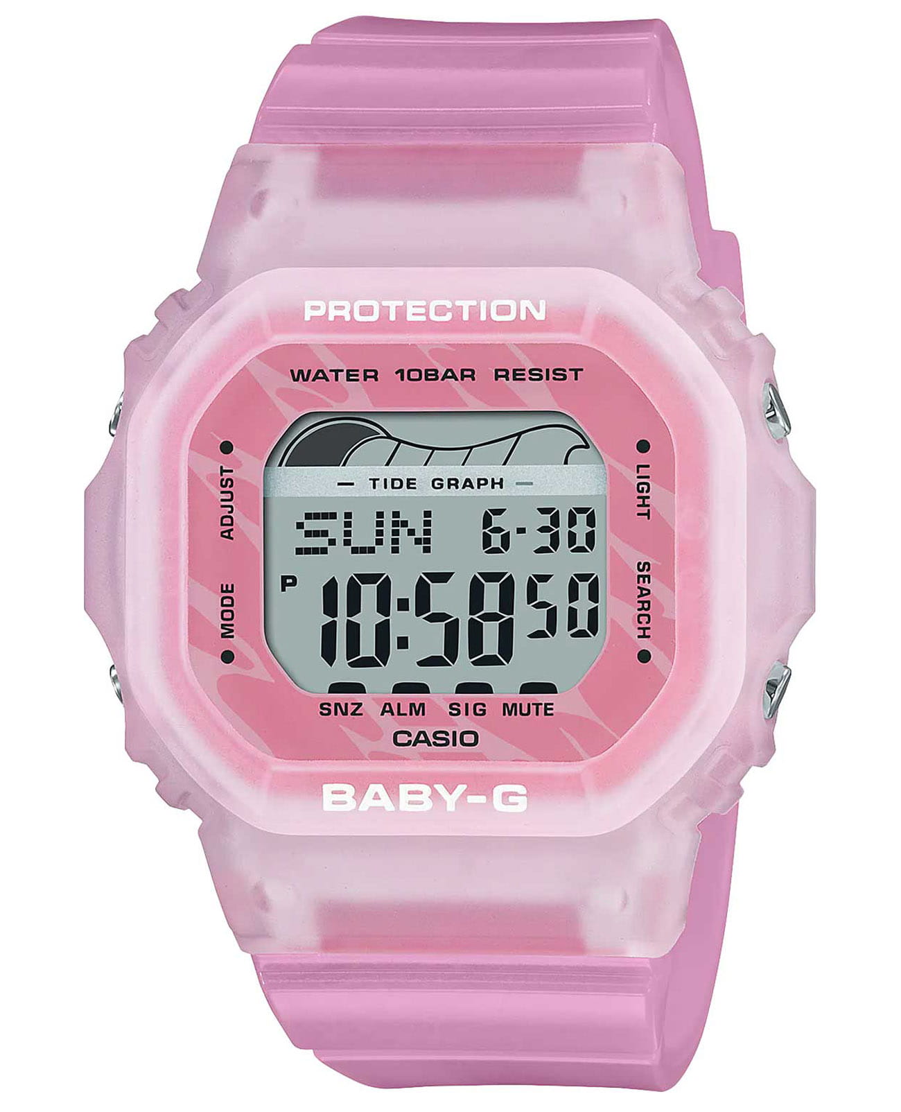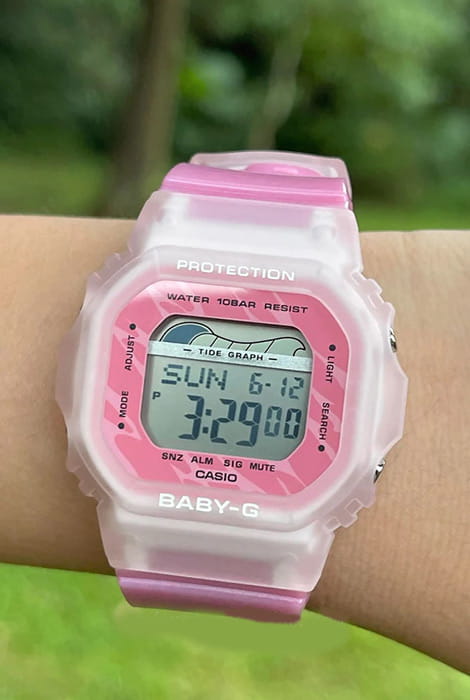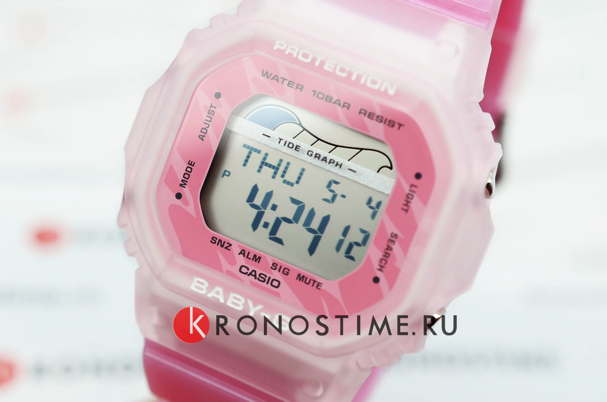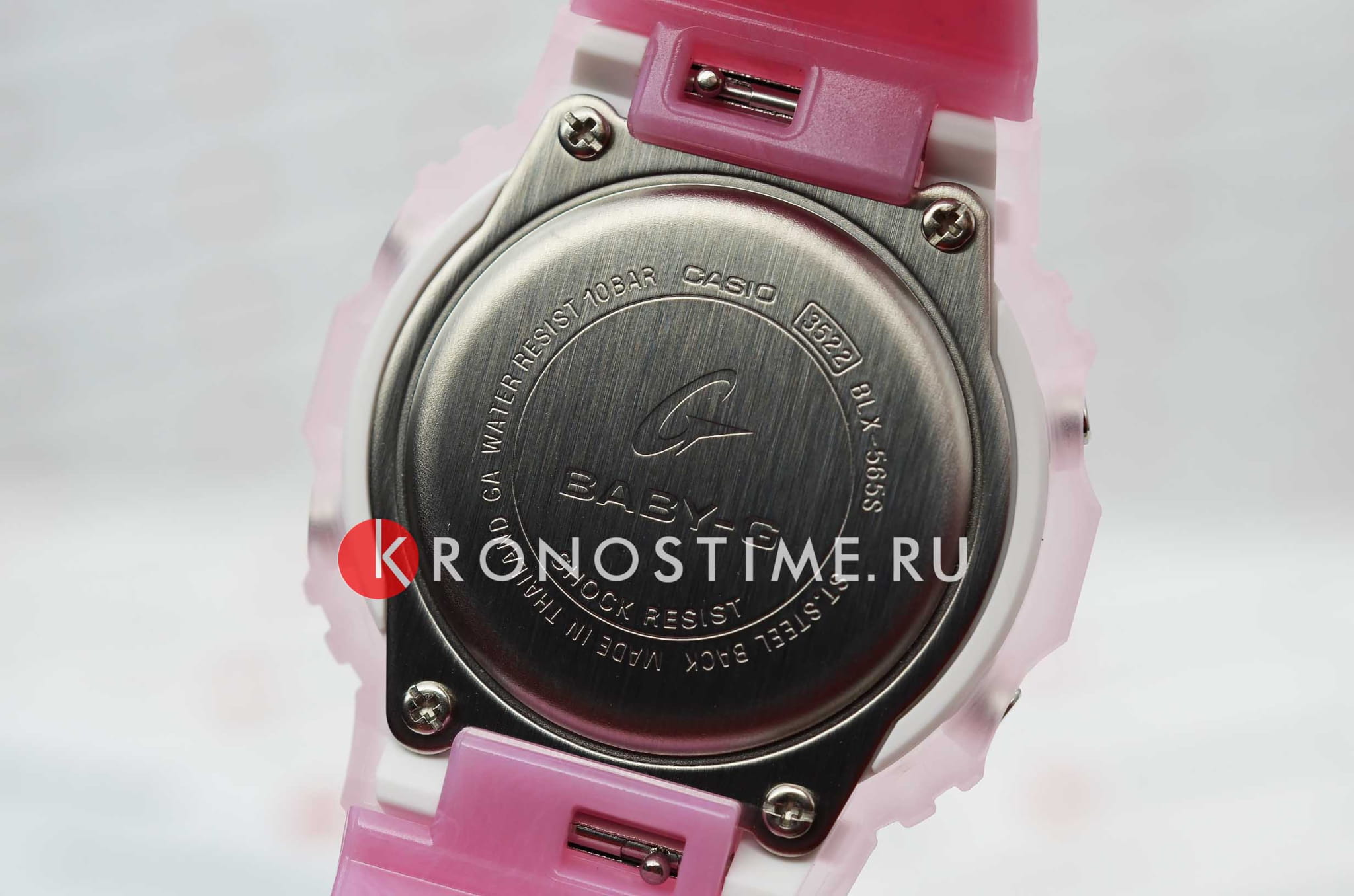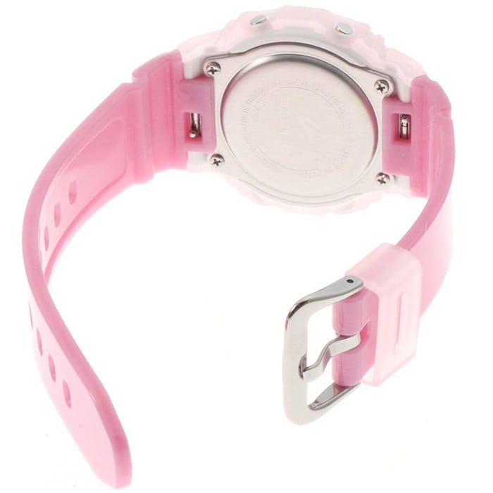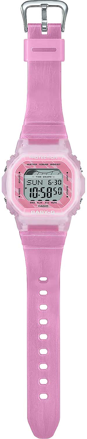 Женские японские часы-хронографХронографФункция позволяет измерять отрезки времени с особой точностью: часы, минуты, секунды. Верным признаком хронографа является наличие на циферблате 3 дополнительных окошек-счётчиков. Casio Baby-G BLX-565S-4E, кварцевый механизм с высокой точностью. Класс водозащиты: 100 метров, позволит плавать, нырять и заниматься другими водными видами спорта. Корпус часов изготовлен из пластика розового цвета. Ударопрочный корпусУдаропрочный корпусМеханизм заключён в корпус, выполненный из современных материалов, устойчивых к ударам, механическим повреждениям и падению с высоты: инновационный пластик, карбон, нержавеющая сталь, титан. защищает механизм от ударов и вибрации. Светодиодная подсветкаСветодиодная подсветкаСветодиодная или LED-подсветка обеспечивает появление яркого холодного свечения за счёт LED-элементов - маленьких лампочек. Они потребляют минимальное количество энергии, чаще всего можно встретить 1 светодиод, в нижней части циферблата. освещает весь циферблат, после отпускания кнопки свечение продолжается еще некоторое время. Особенность модели в функциях будильникаБудильникБуди́льник — часы, в заданный момент времени подающие звуковой, световой и/или в редких случаях другой сигнал., секундомераСекундомерСекундоме́р — прибор, способный измерять интервалы времени с точностью до долей секунды., таймераТаймерОтсчитывает секунды в обратном направлении в заданном интервале времени. и мирового времениМировое время Полезное часовое усложнение, отображающее время в основных городах и известных областях по всему миру, оно связано с часовыми поясами, удобно для путешественников и бизнесменов. . Циферблат подсвечивается ярким светодиодомСветодиодная подсветкаСветодиодная или LED-подсветка обеспечивает появление яркого холодного свечения за счёт LED-элементов - маленьких лампочек. Они потребляют минимальное количество энергии, чаще всего можно встретить 1 светодиод, в нижней части циферблата.. Послесвечение. Цвет подсветки: белый. Отображение возраста и фазы Луны. Отображение сведений о приливах и отливах на заданную дату и время. 12-ти и 24-х часовой формат времени. Функции включения/отключения летнего времени и включения/отключения звука. Батарея рассчитана на 3 года. Задняя крышка крепится на 4-х винтах.