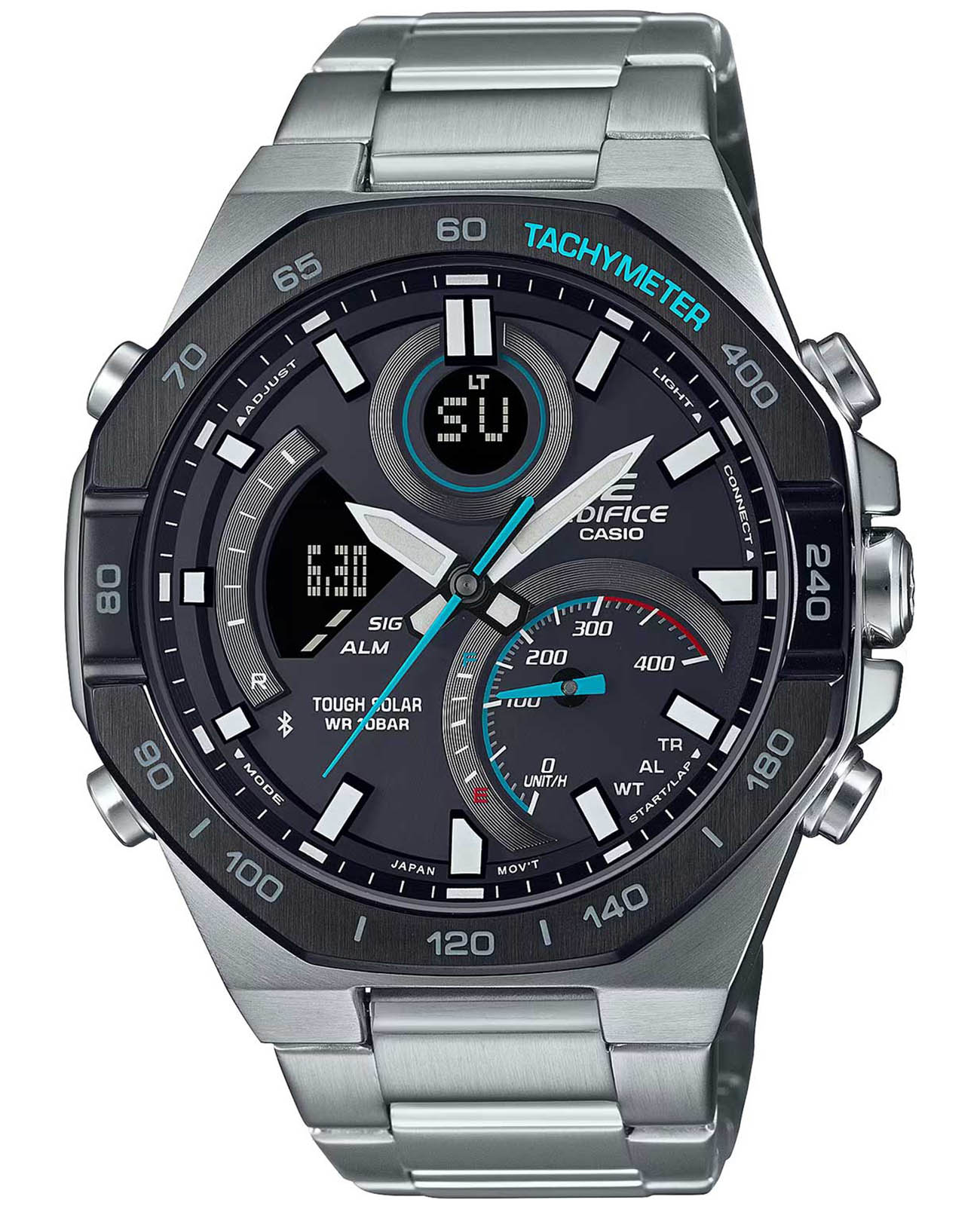 Японские мужские часы-хронографХронографФункция позволяет измерять отрезки времени с особой точностью: часы, минуты, секунды. Верным признаком хронографа является наличие на циферблате 3 дополнительных окошек-счётчиков. Casio Edifice ECB-950DB-1A . Tough SolarTough SolarТехнология основана на подзарядке аккумулятора от источника солнечного света, специальная панель улавливает солнечные лучи и преобразует их в энергию для работы часов. Достаточно пары минут нахождения на солнце для функционирования часов в течении суток., индикатор низкого заряда батареи. Функция автоматического сохранения энергии. Время работы аккумулятора без подзарядки приблизительно 6 месяцев, при включенной функции сохранения энергии приблизительно 19 месяцев. Двойная подсветка Super Illuminator с функцией Afterglow, одновременно подсвечивается аналоговый циферблат и цифровой дисплей. Люминесцентное покрытиеЛюминесцентное покрытиеПозволяет считывать показания времени в темноте. Производители наносят на стрелки, часовые индексы, безель или поверхность циферблата светонакопительный состав, дающий холодное свечение. Neobrite обеспечивает длительное послесвечение в темноте даже после кратковременного нахождения на свету. Таймер обратного отсчета от 1 сек до 24 ч. Мировое время – 39 городов (39 часовых поясов). Автоматический переход на зимнее и летнее время. Беспроводная технология BluetoothBluetoothСовременная технология, позволяющая синхронизировать часы с телефоном и переносить данные. Часы с Bluetooth расширяют возможности вашего смартфона и делают его использование ещё более удобным.. Приложение EDIFICE Connected позволяет вести журнал показаний секундомера и прохождения этапов, вычислять разность между заданным временем и временем этапа. Память на 200 этапов. Измерение скорости отображается на ретроградном циферблате в положении 4 часа. Функция перемещения стрелок для беспрепятственного просмотра информации на цифровых дисплеях, включения/отключения звука и поиска телефона. Заводная головка с защитой. Браслет с тройной раскладывающейся застежкой, расстегиваемой одним касанием. Стальной корпус, защищенный минеральным стекломМинеральное стеклоМинеральное стекло представляет собой искусственно выращенный минерал кварца. Такое стекло отличается особой устойчивостью к повреждениям и царапинам. Уступает по некоторым качествам сапфировому стеклу.. Стальной браслет на раскладной застёжкеРаскладная застёжкаТакой тип застёжки используется только на браслетах из металла. Она никогда не раскрывается полностью, происходит разделение на 2 и более частей. Раскладывающая застёжка снизит вероятность потери часов к минимуму.. СекундомерСекундомерСекундоме́р — прибор, способный измерять интервалы времени с точностью до долей секунды.. Класс водозащиты: 100 метров, позволит плавать, нырять и заниматься другими водными видами спорта.