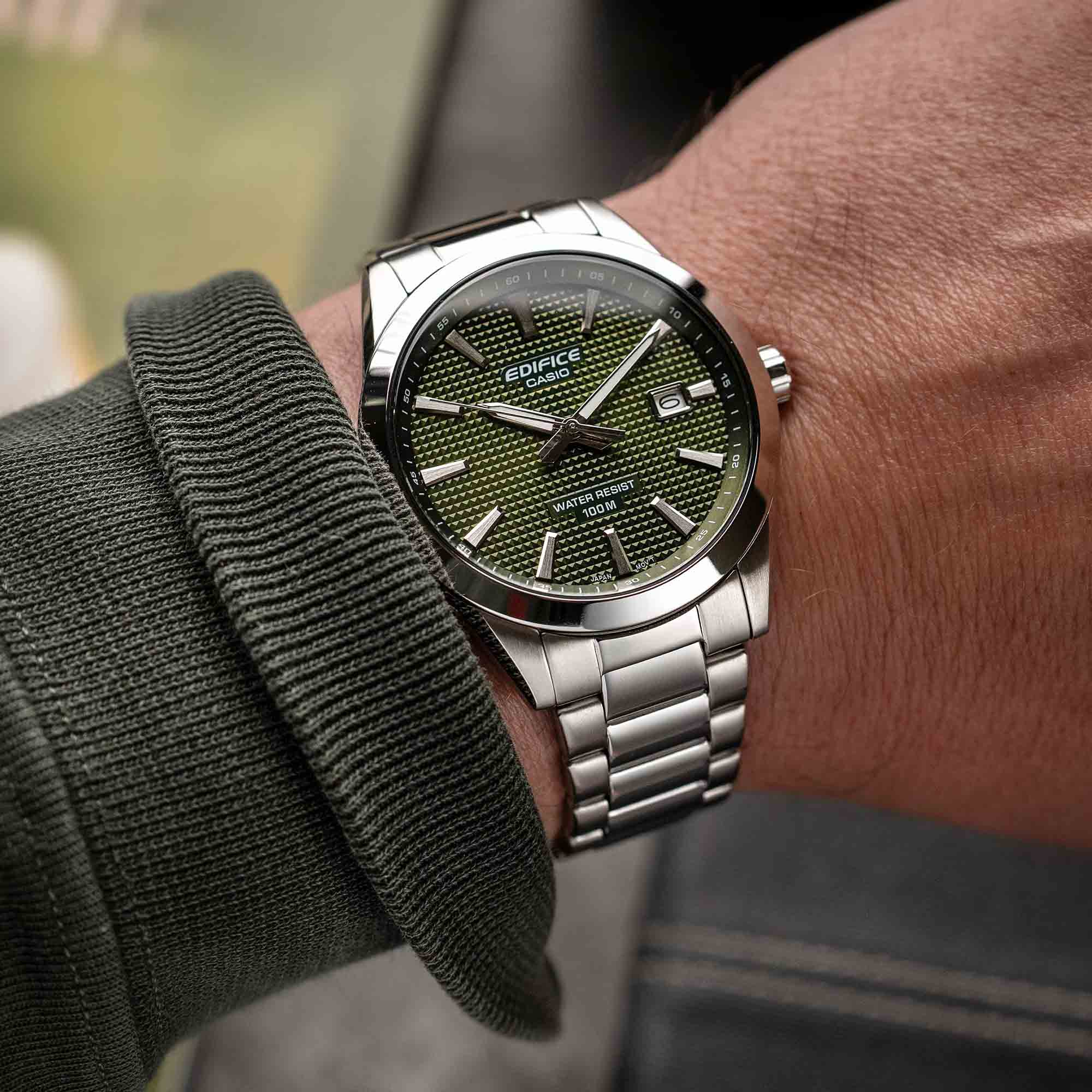Мужские кварцевые часы Casio Edifice EFV-160D-3AV — это стильный аксессуар, сочетающий в себе надёжность и функциональность. Модель выполнена из нержавеющей стали с размерами корпуса 47,5x40x10 мм, а его масса составляет 110 г. Защиту механизма обеспечивает минеральное стеклоМинеральное стеклоМинеральное стекло представляет собой искусственно выращенный минерал кварца. Такое стекло отличается особой устойчивостью к повреждениям и царапинам. Уступает по некоторым качествам сапфировому стеклу. с сферической формой, устойчивое к повреждениям. Задняя пластина имеет винтовой замок, что обеспечивает надёжную фиксацию на запястье. Браслет из нержавеющей стали оснащён тройной застёжкой с одним касанием, обеспечивающей комфорт и надёжную фиксацию. Стандартный размер ремешка регулируется от 150 до 205 мм. Часы водонепроницаемы до 100 метров (, что позволяет использовать их при плавании и других водных активностях без глубокого погружения. Точность хода составляет ±20 секунд в месяц, а срок службы батареи — примерно 3. Эти часы станут универсальным аксессуаром для тех, кто ценит сочетание стиля, функциональности и надёжности — идеальный выбор для повседневной носки и активного образа жизни.