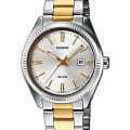 Японские женские часы Casio Collection LTP-1302SG-7A с минеральным стекломМинеральное стеклоМинеральное стекло представляет собой искусственно выращенный минерал кварца. Такое стекло отличается особой устойчивостью к повреждениям и царапинам. Уступает по некоторым качествам сапфировому стеклу.. Светящееся покрытие обеспечивает длительную подсветку в темное время суток после короткого воздействия света. Корпус выполнен из гипоаллергенной латуни. Модель комплектуется надёжным механизмом, точность хода которого составляет +/- 20 сек/мес. Стрелки с люминесцентным покрытиемЛюминесцентное покрытиеПозволяет считывать показания времени в темноте. Производители наносят на стрелки, часовые индексы, безель или поверхность циферблата светонакопительный состав, дающий холодное свечение.. Стальной браслет на раскладной застёжкеРаскладная застёжкаТакой тип застёжки используется только на браслетах из металла. Она никогда не раскрывается полностью, происходит разделение на 2 и более частей. Раскладывающая застёжка снизит вероятность потери часов к минимуму. с IP-покрытиемIP-покрытиеМетод ионного напыления. Демонстрирует повышенную устойчивость к истиранию, окислению и химическим веществам. Под воздействием высокого давления и температуры около 1500°C молекулы металла надёжно соединяются с частицами корпуса часов.. Окошко даты находится в положении 3 часа. Водонепроницаемость 50 метров, позволит защитить корпус от случайных брызг или капель дождя.