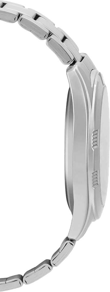 Классические черты этих женских часов прекрасно дополнят стильный образ любой девушки. Циферблат с люминесцентным покрытиемЛюминесцентное покрытиеПозволяет считывать показания времени в темноте. Производители наносят на стрелки, часовые индексы, безель или поверхность циферблата светонакопительный состав, дающий холодное свечение. стрелок, дополнен минеральным стекломМинеральное стеклоМинеральное стекло представляет собой искусственно выращенный минерал кварца. Такое стекло отличается особой устойчивостью к повреждениям и царапинам. Уступает по некоторым качествам сапфировому стеклу. , устойчивым к мелким механическим повреждениям. Окошко даты находится в положении 3 часа. Заводная головка с защитой. Батарея рассчитана на 3 года. Браслет с раскладной застёжкойРаскладная застёжкаТакой тип застёжки используется только на браслетах из металла. Она никогда не раскрывается полностью, происходит разделение на 2 и более частей. Раскладывающая застёжка снизит вероятность потери часов к минимуму.