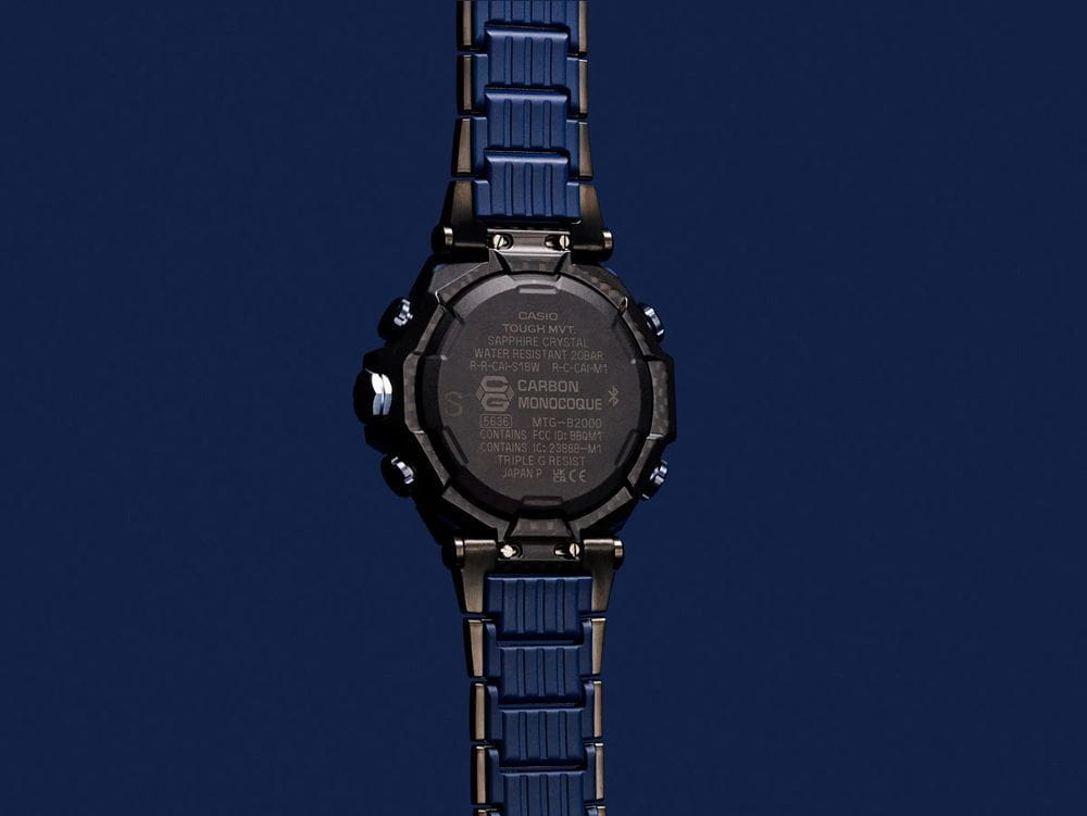 Модель Casio G-Shock MTG-B2000YBD-2A из премиальной серии MT-G сочетает в себе передовые технологии и элегантный дизайн. Корпус диаметром 55,1 мм выполнен из углеродного соединения с двойной защитной структурой Dual Core Guard, обеспечивая высокую прочность и лёгкость конструкции. Браслет представляет собой комбинацию нержавеющей стали и тонкого синего слоя смолы, обеспечивая комфорт при носке.