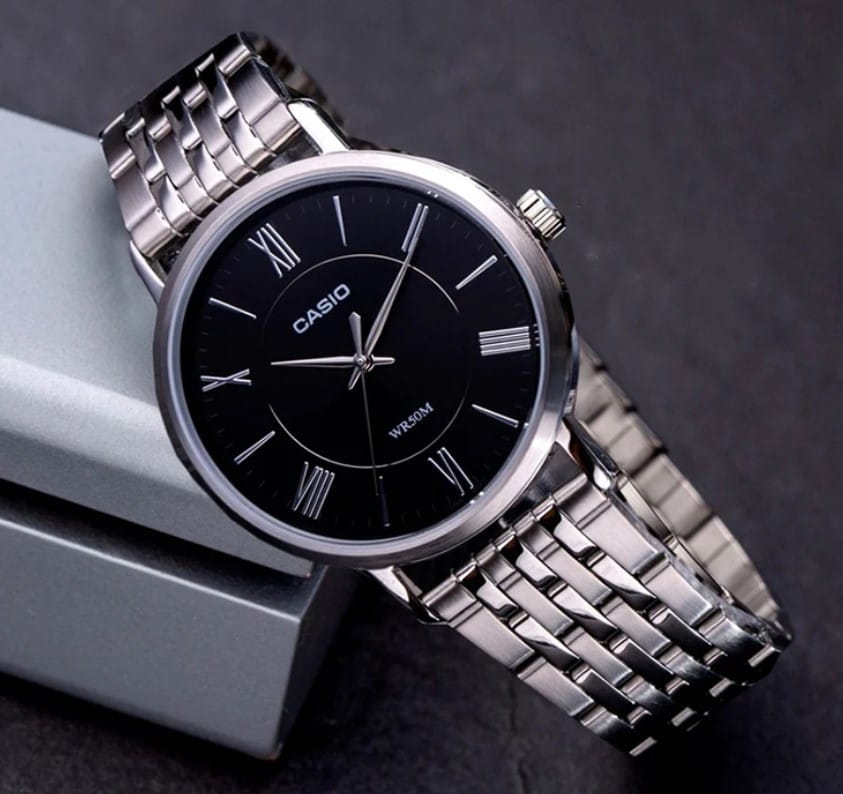Японские мужские часы с минеральным стекломМинеральное стеклоМинеральное стекло представляет собой искусственно выращенный минерал кварца. Такое стекло отличается особой устойчивостью к повреждениям и царапинам. Уступает по некоторым качествам сапфировому стеклу. Casio Collection MTP-B110D-1A, кварцевый механизм с высокой точностью. Класс водозащиты: 50 метров, позволит защитить корпус от случайных брызг или капель дождя. Корпус и браслет часов изготовлены из стали. Браслет с раскладной застёжкойРаскладная застёжкаТакой тип застёжки используется только на браслетах из металла. Она никогда не раскрывается полностью, происходит разделение на 2 и более частей. Раскладывающая застёжка снизит вероятность потери часов к минимуму..